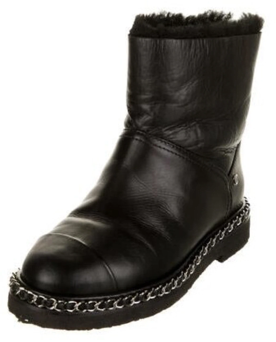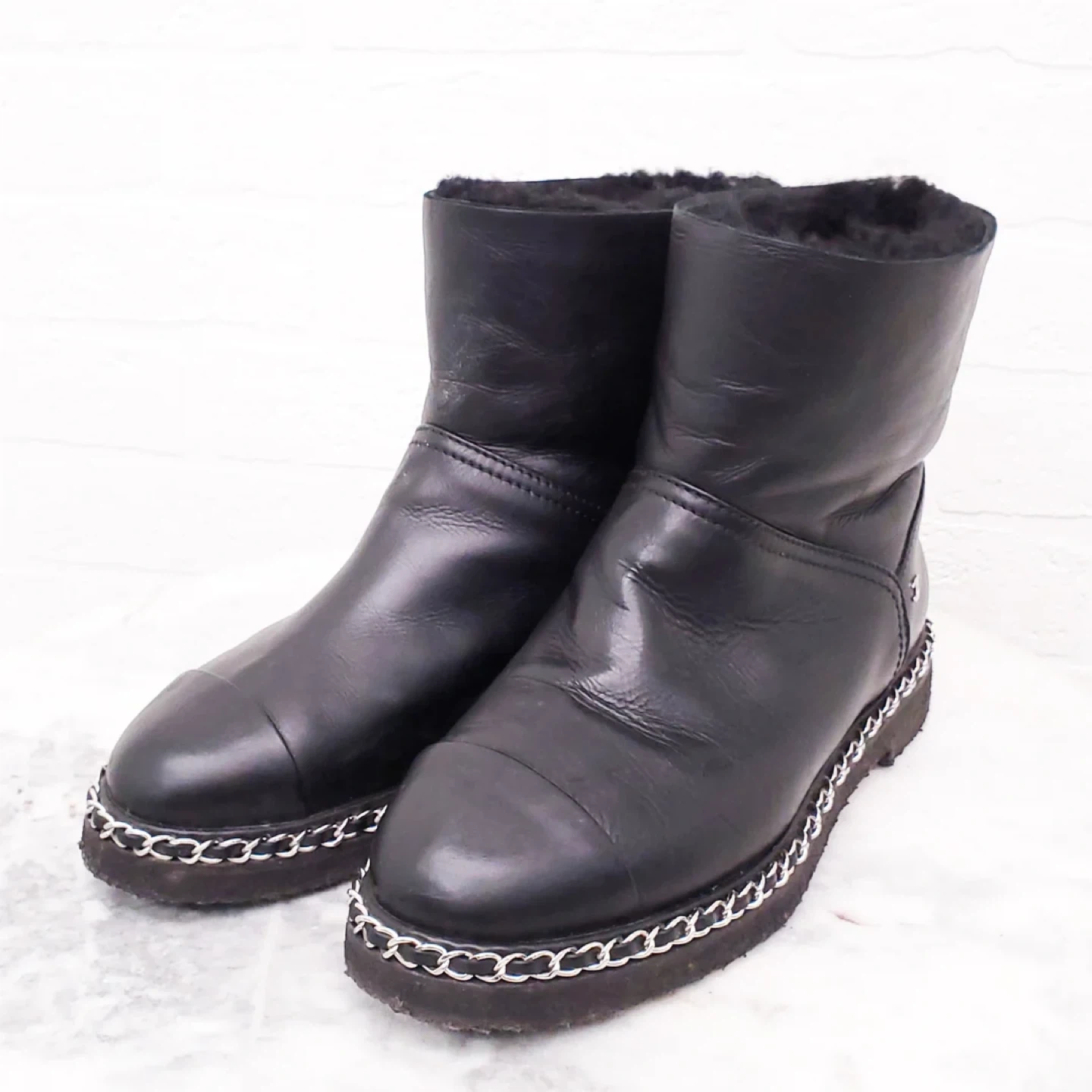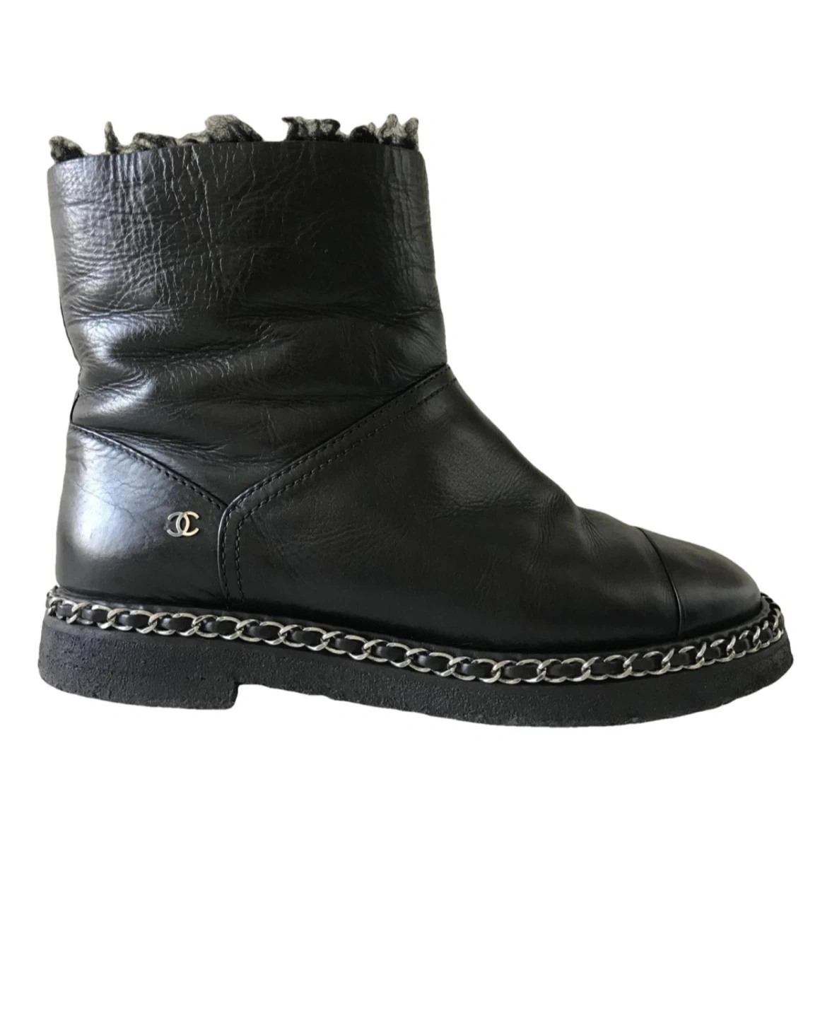 CHANEL leather boots. Shearling lining. Chain detail around the sole. Classic Chanel style. Excellent condition. Some wear to soles