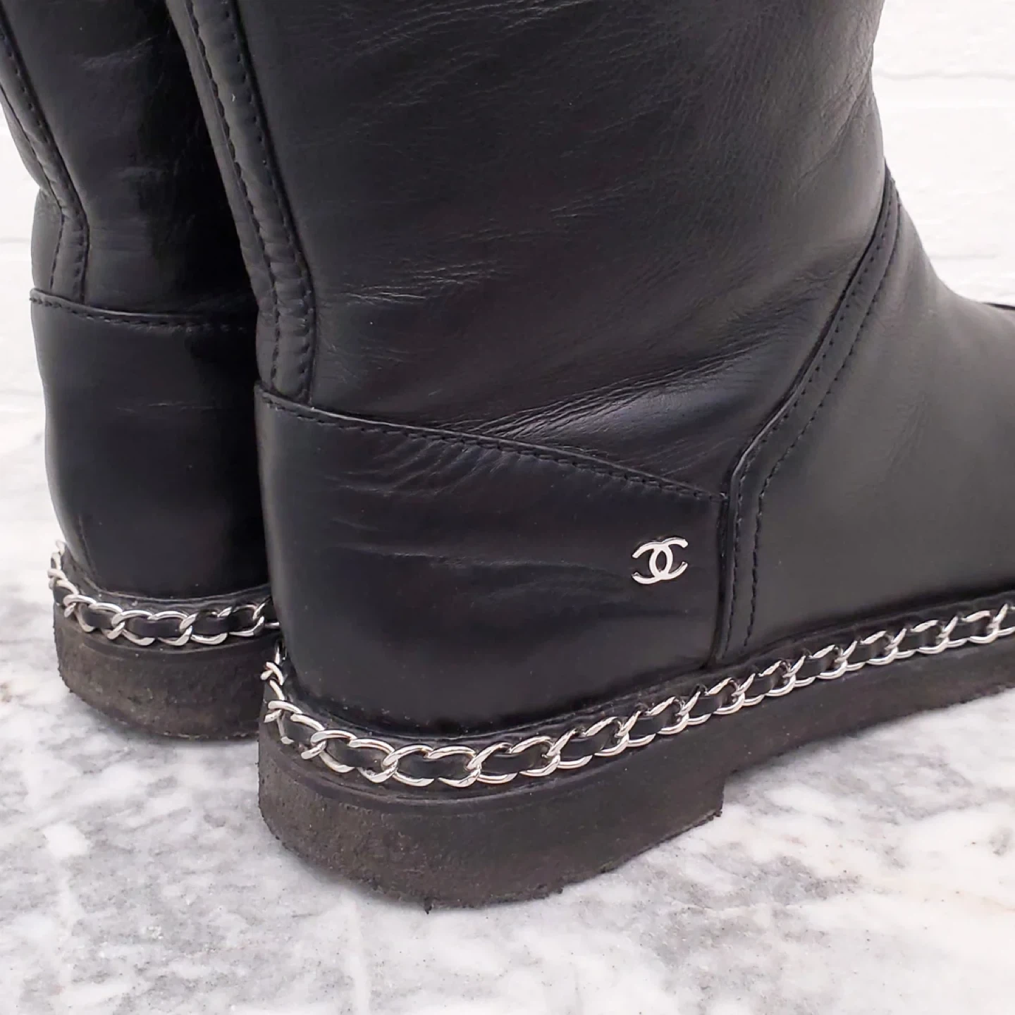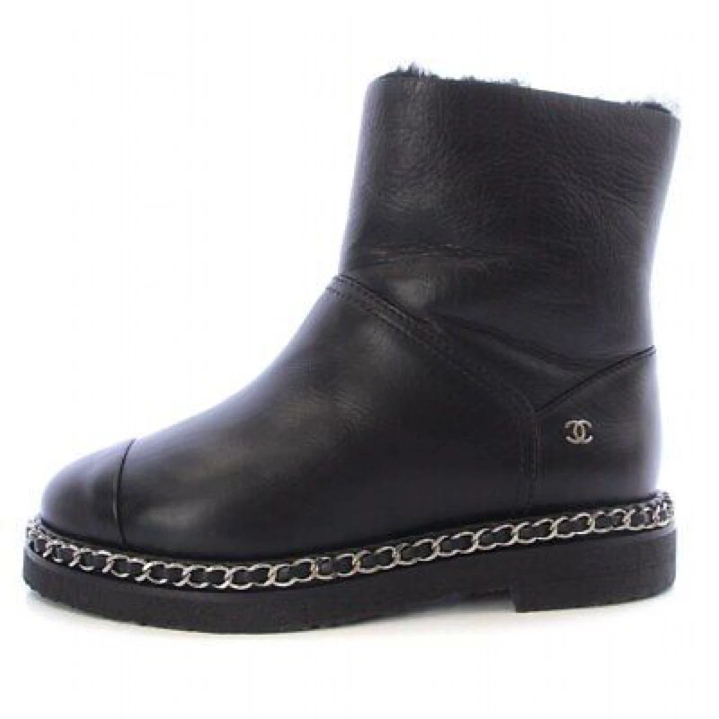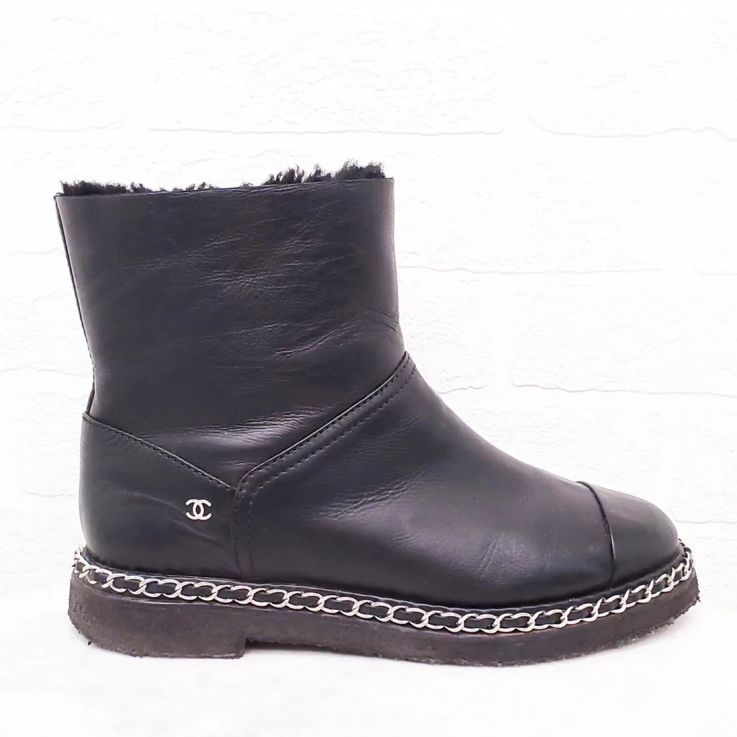 CHANEL leather boots. Shearling lining. Chain detail around the sole. Classic Chanel style. Excellent condition. Some wear to soles