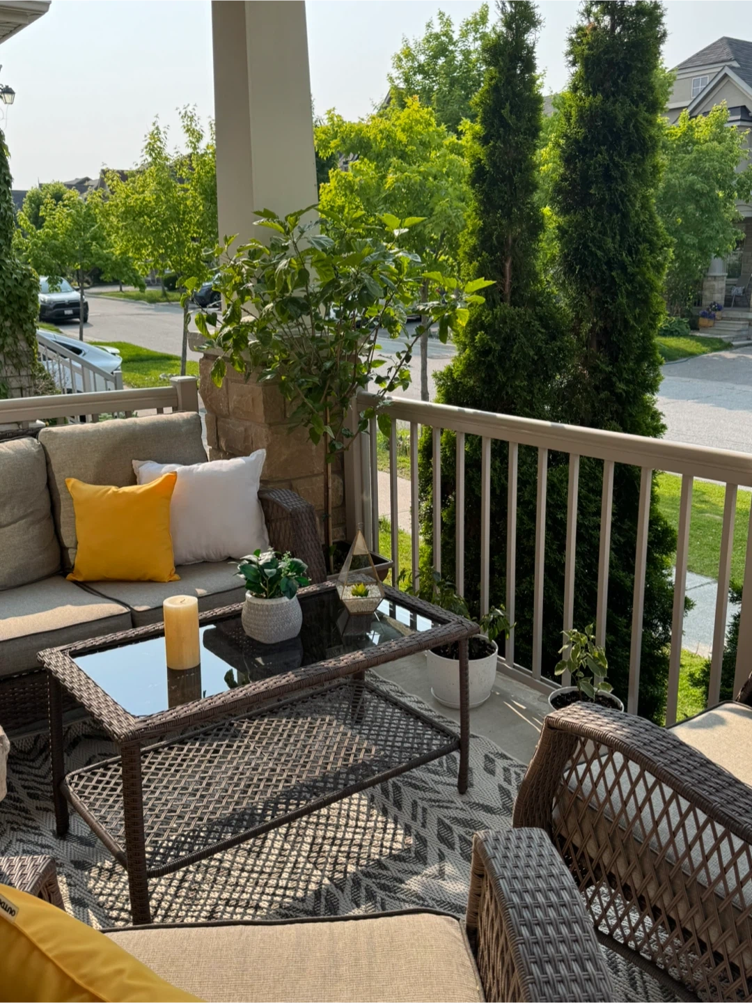 Selling a lovely patio set that includes a loveseat, two chairs, and a coffee table. It's perfect for enjoying the outdoors in comfort and style. The set features a wicker design and neutral cushions that will complement any outdoor space. The coffee table has a glass top.