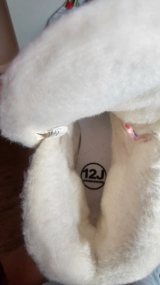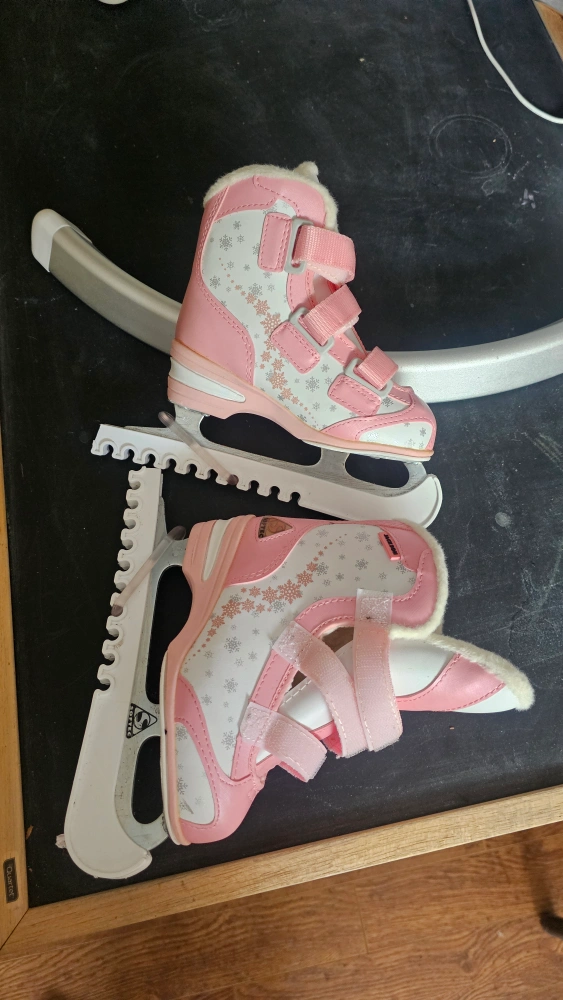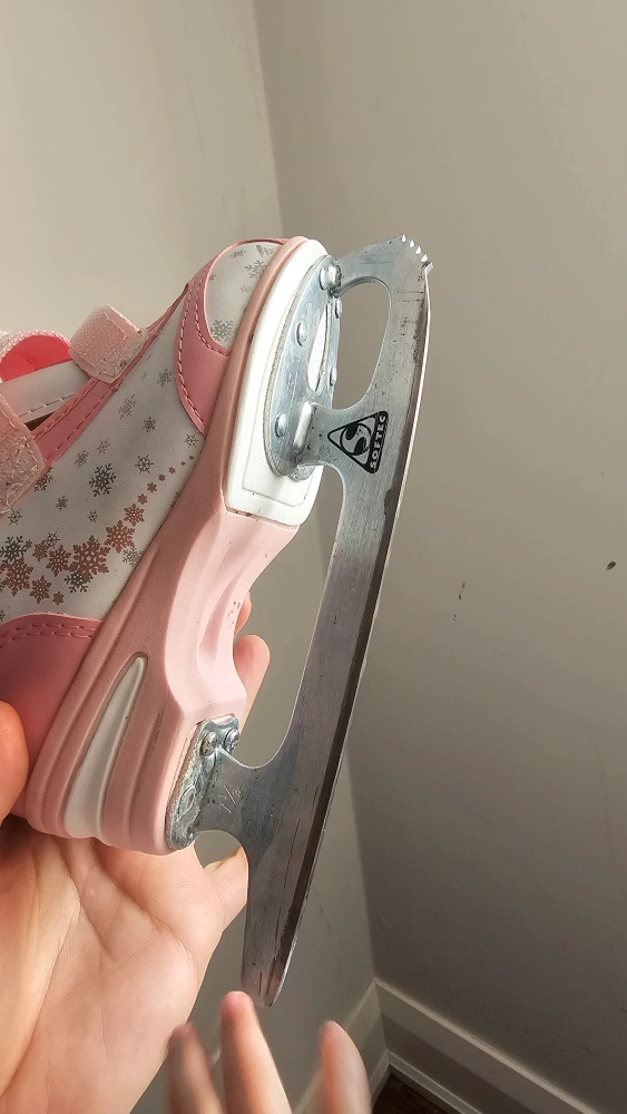 Selling a pair of girls' ice skates in size 12J. They have a cute pink and white design with snowflake patterns. Great for hitting the ice rink!