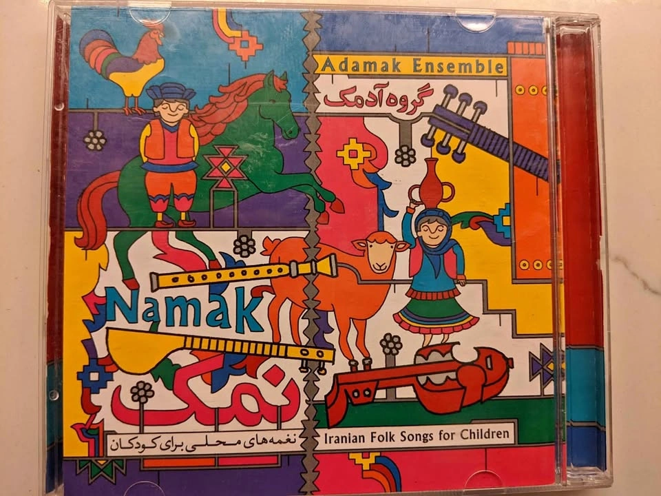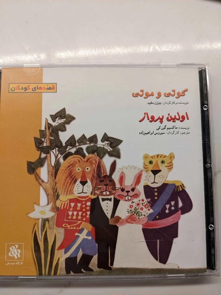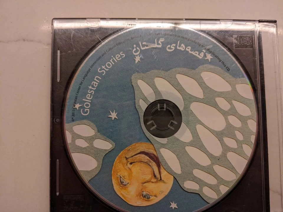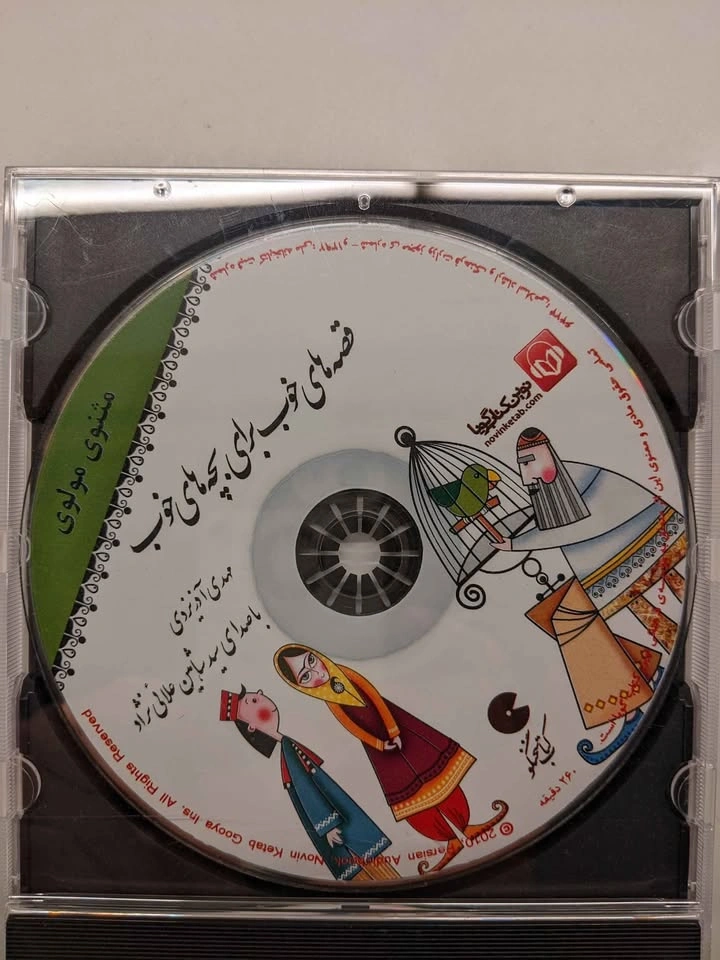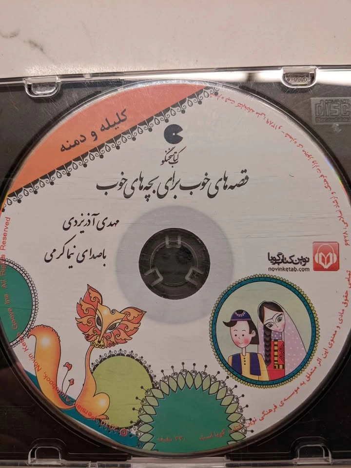 25About 40 CDs of rare Persian stories and music for children, including: Angoshte Tala Merry Poppins Pinocchio Donyaye Bacheha Hasan va Khanom Hana 1 & 2 Hasan Kachal Bozboz Ghandi Zorro 1 & 2 Dozd va Morgh Felfeli Gulliver Khaleh Sookeh Sleeping Beauty Alice Amir Arsalan Tom Thumb Torb Dome Gorbeh Little Fairy Asiaban's Son The Aristocats (Persian and French) Khoros Zari Pirhan Pari Har Kasi Kari Dareh Laurel and Hardy Pirehan Goli Arash Kamangir Sindbad The Little Prince City of Mice 1 & 2 Madraseh Mooshha Stories of Masnavi Stories of Golestan Stories of Man va Madar Namak Shaparak Khanom Kooti va Kooti The First Flight Steeles and Hilda