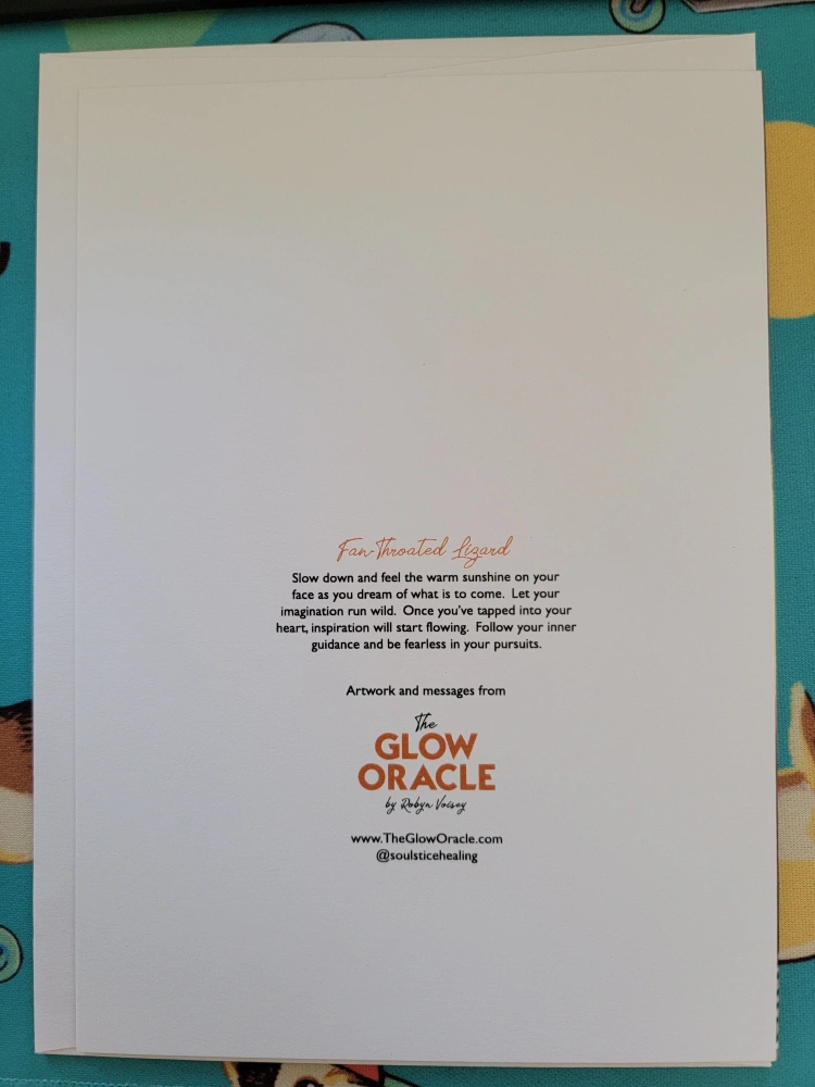 A beautiful greeting card featuring a fan-throated lizard. The artwork and messages are from The Glow Oracle by Robyn Vieau. Perfect for sending a thoughtful note to someone special.