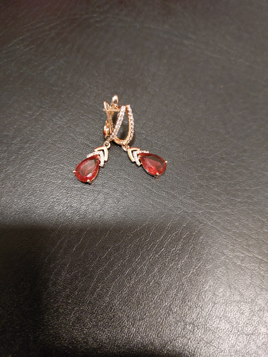 A pair of drop earrings featuring a red stone. These earrings have a gold-tone finish with small clear stones around the setting. They would be a lovely addition to any jewelry collection