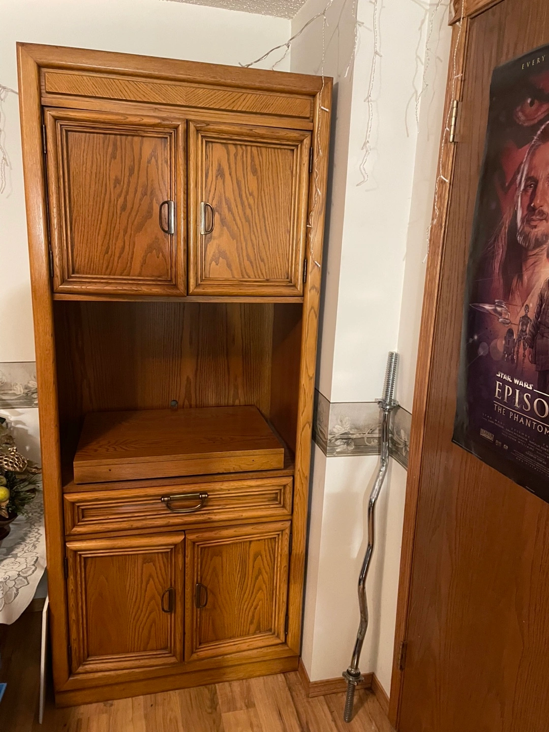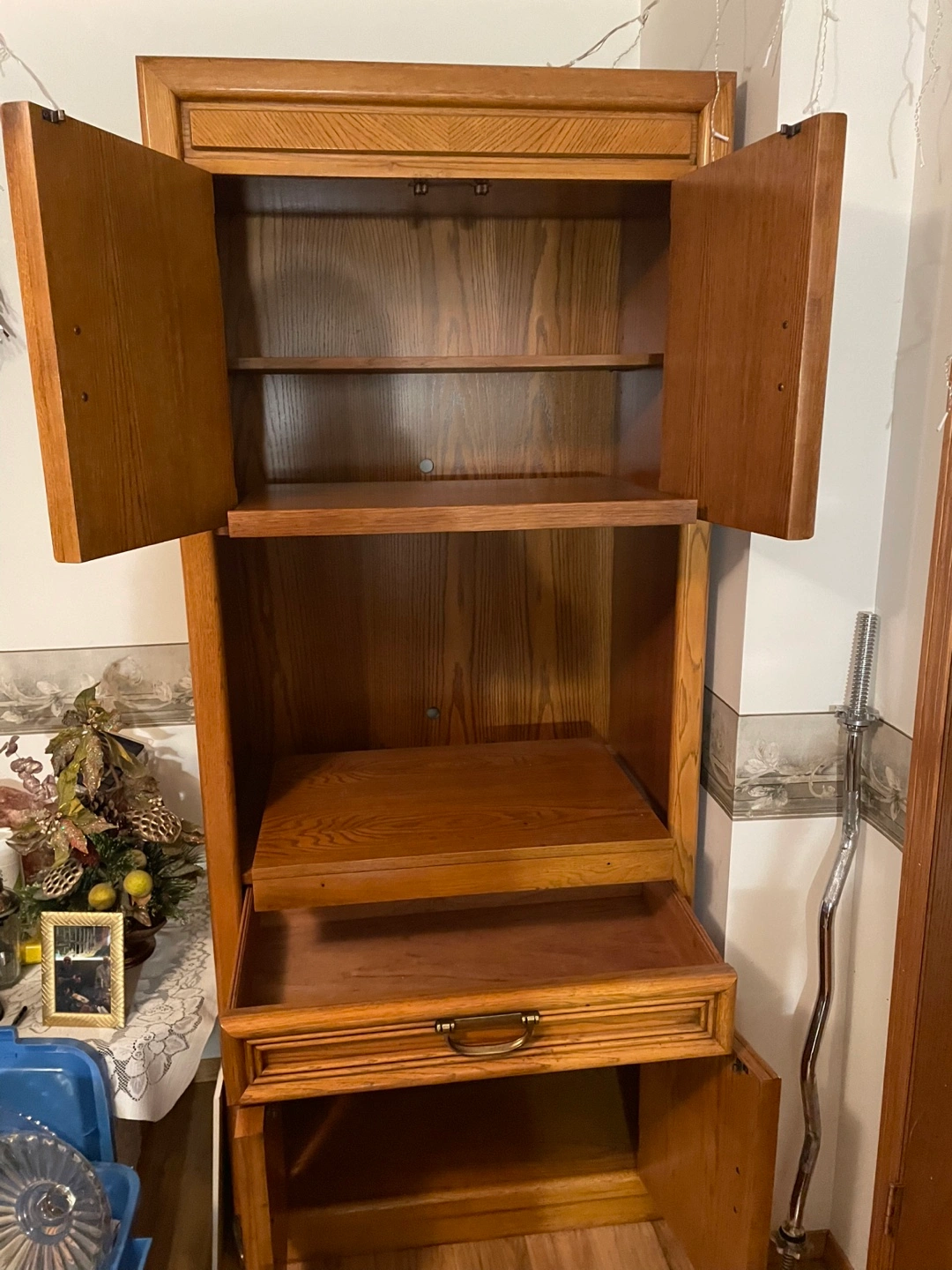 Selling a wooden storage cabinet in good condition. It features a top cabinet with doors, an open shelf, and a bottom cabinet with a drawer. Perfect for extra storage in any room cash only no e-transfers thank you