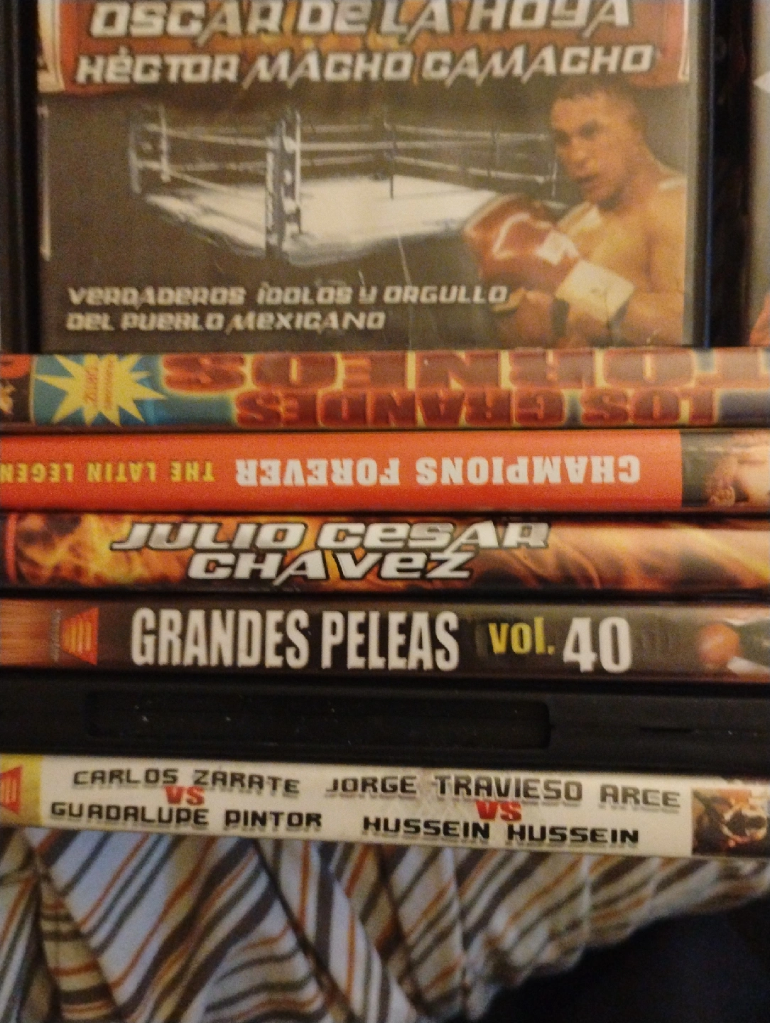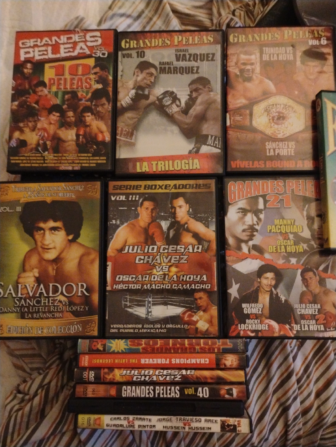 Selling a collection of boxing and soccer DVDs. Titles include Oscar De La Hoya, Julio Cesar Chavez, and Grandes Peleas. Also includes a soccer DVD.