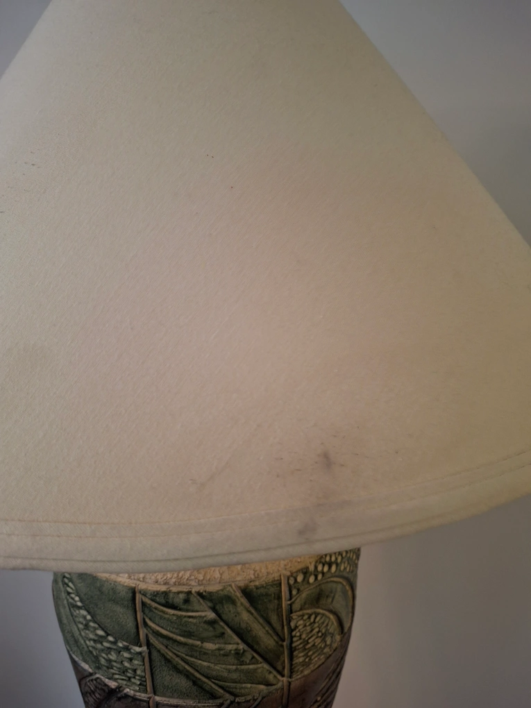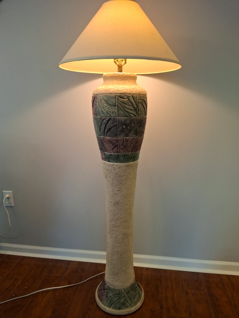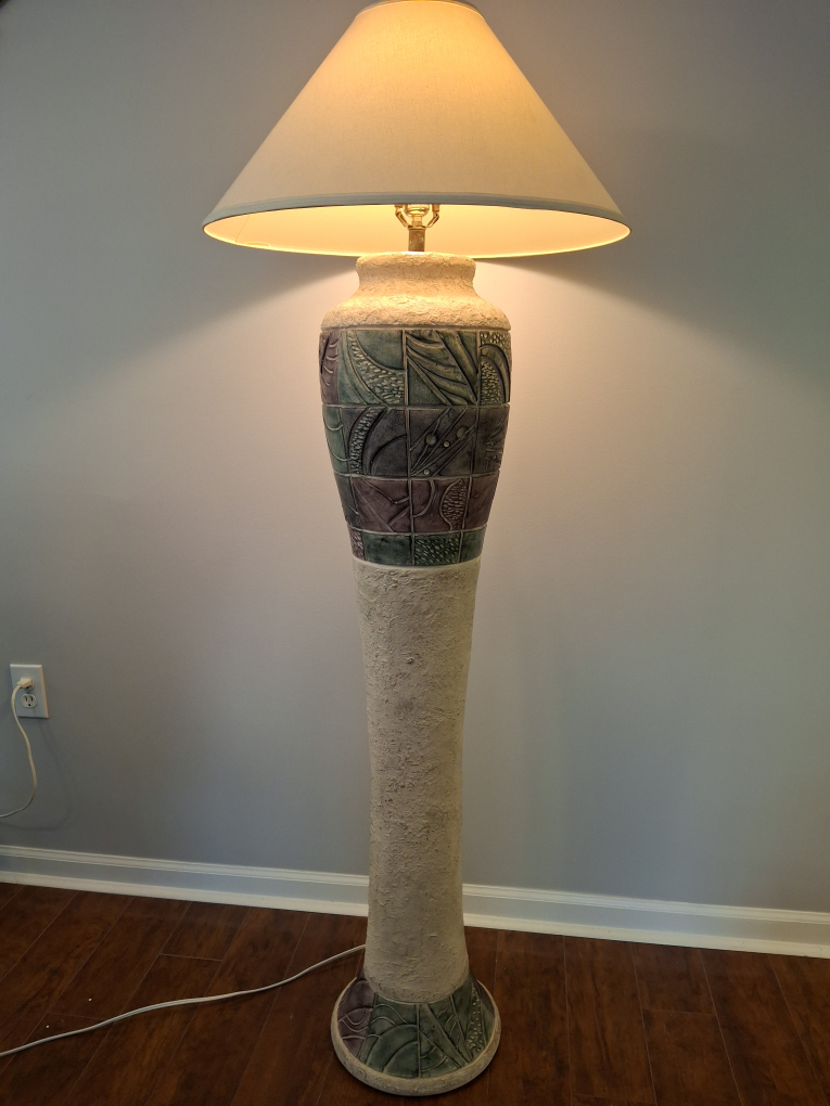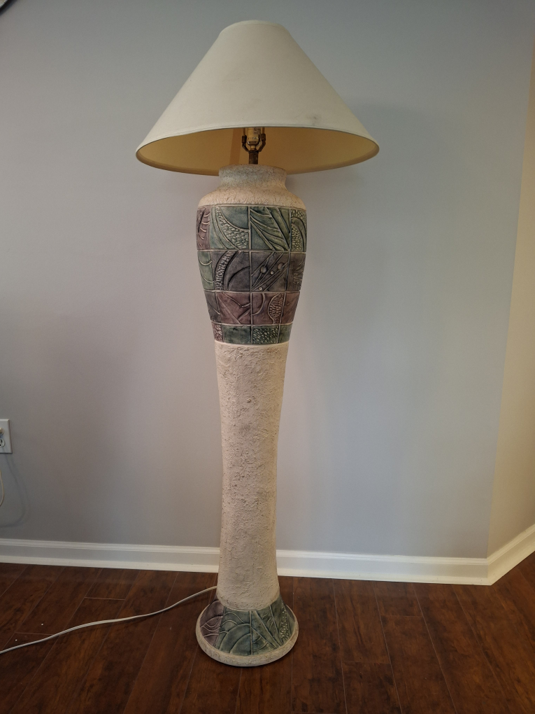 Decorative standing lamp with tri-light switch to adjust brightness. There are some marks on the lamp shade but it can be replaced. Measurements below do not include the lamp shade.