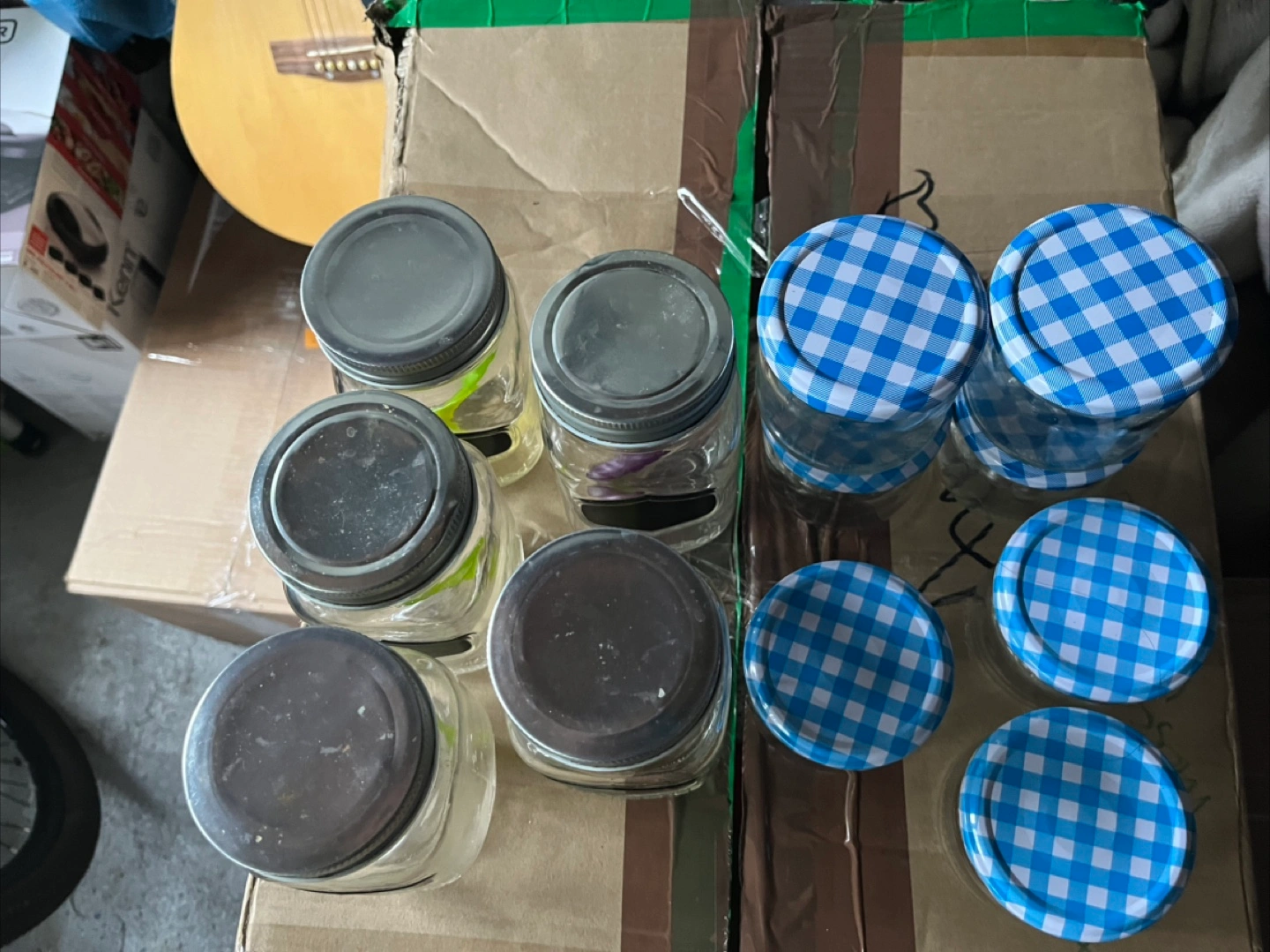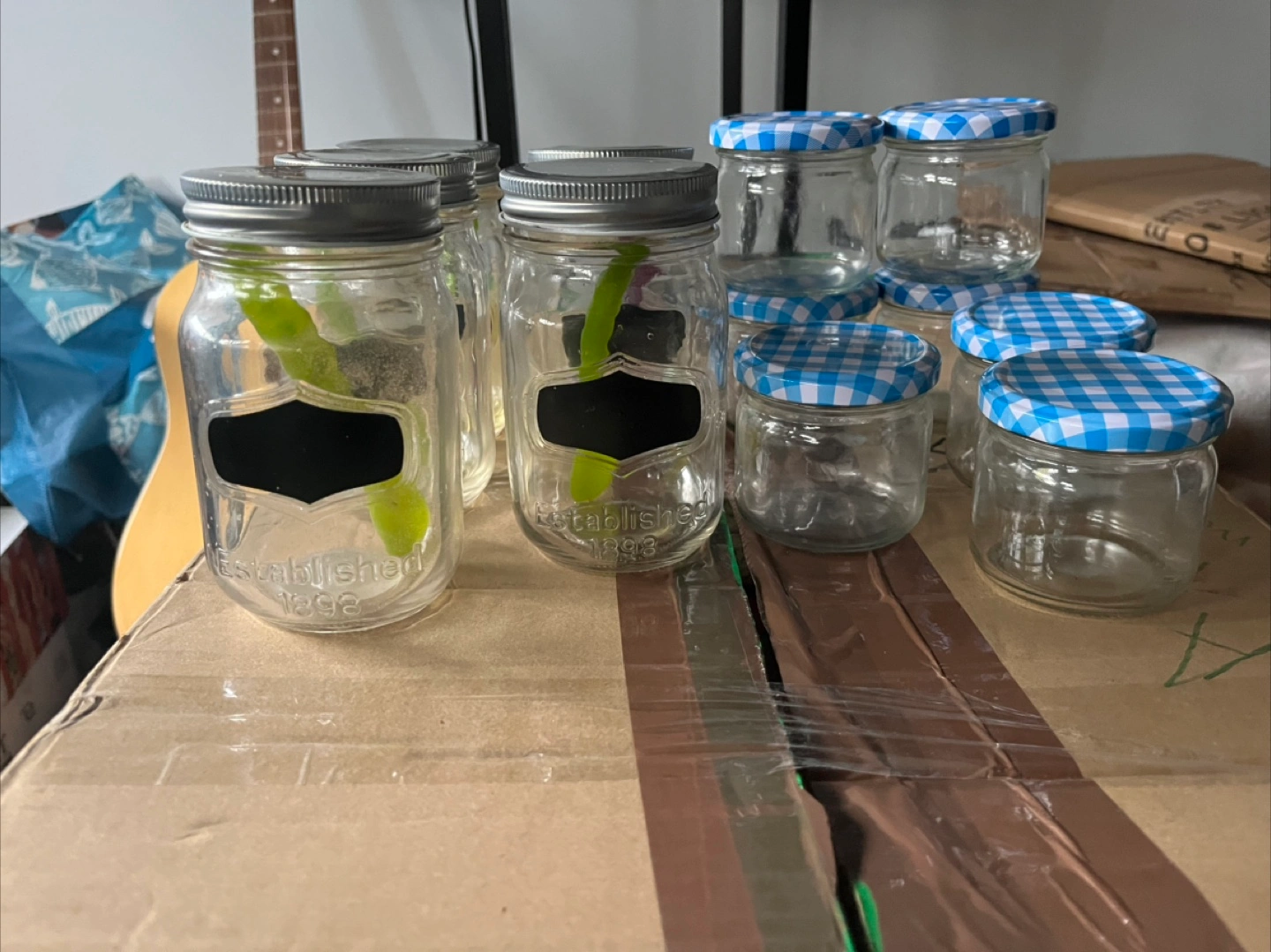 Selling a set of glass jars with lids. They're great for canning, storage, or crafts. Some have plain metal lids, while others have a cute blue and white checkered pattern. They are in good condition!
