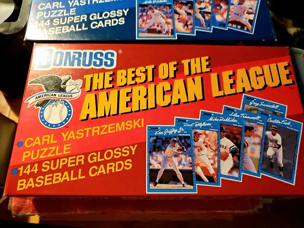 Selling a box of Donruss The Best of the American League baseball cards, featuring Carl Yastrzemski. It's a puzzle with 144 super glossy baseball cards featuring best players from 1990. Notable card includes Ken Griffey Jr. first year card with the Mariners Baseball Club.