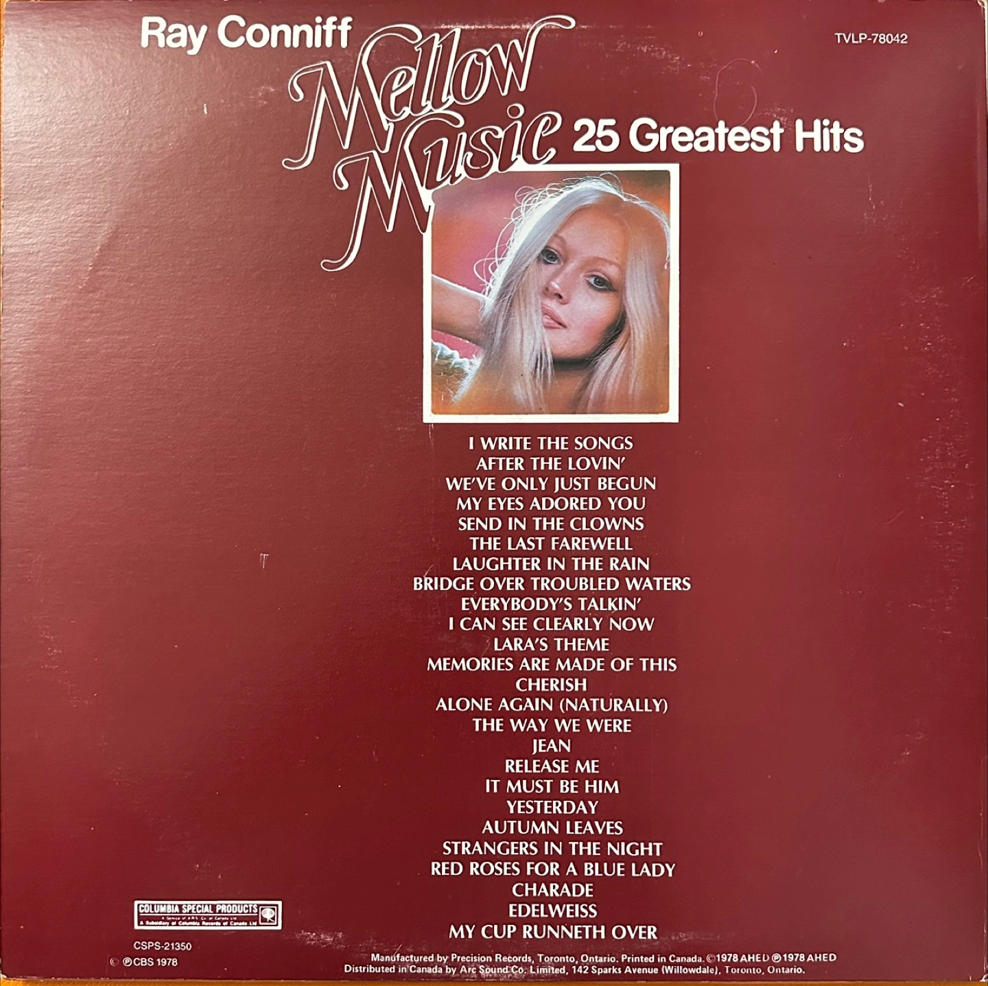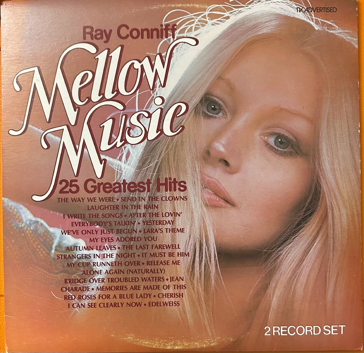 Selling a vintage rare Ray Conniff 'Mellow Music' 25 Greatest Hits 2-record set! The record features classics like 'The Way We Were,' 'Send In The Clowns,' and 'Bridge Over Troubled Waters'. Great for any vinyl collector or Ray Conniff fan!
