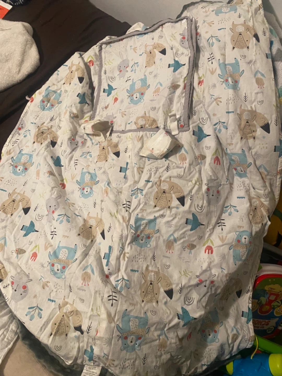 Keep your little one cozy with this JJ Cole car seat cover! It features a cute animal pattern on one side and a soft, textured gray fabric on the other. Perfect for keeping baby warm and snug in their car seat.