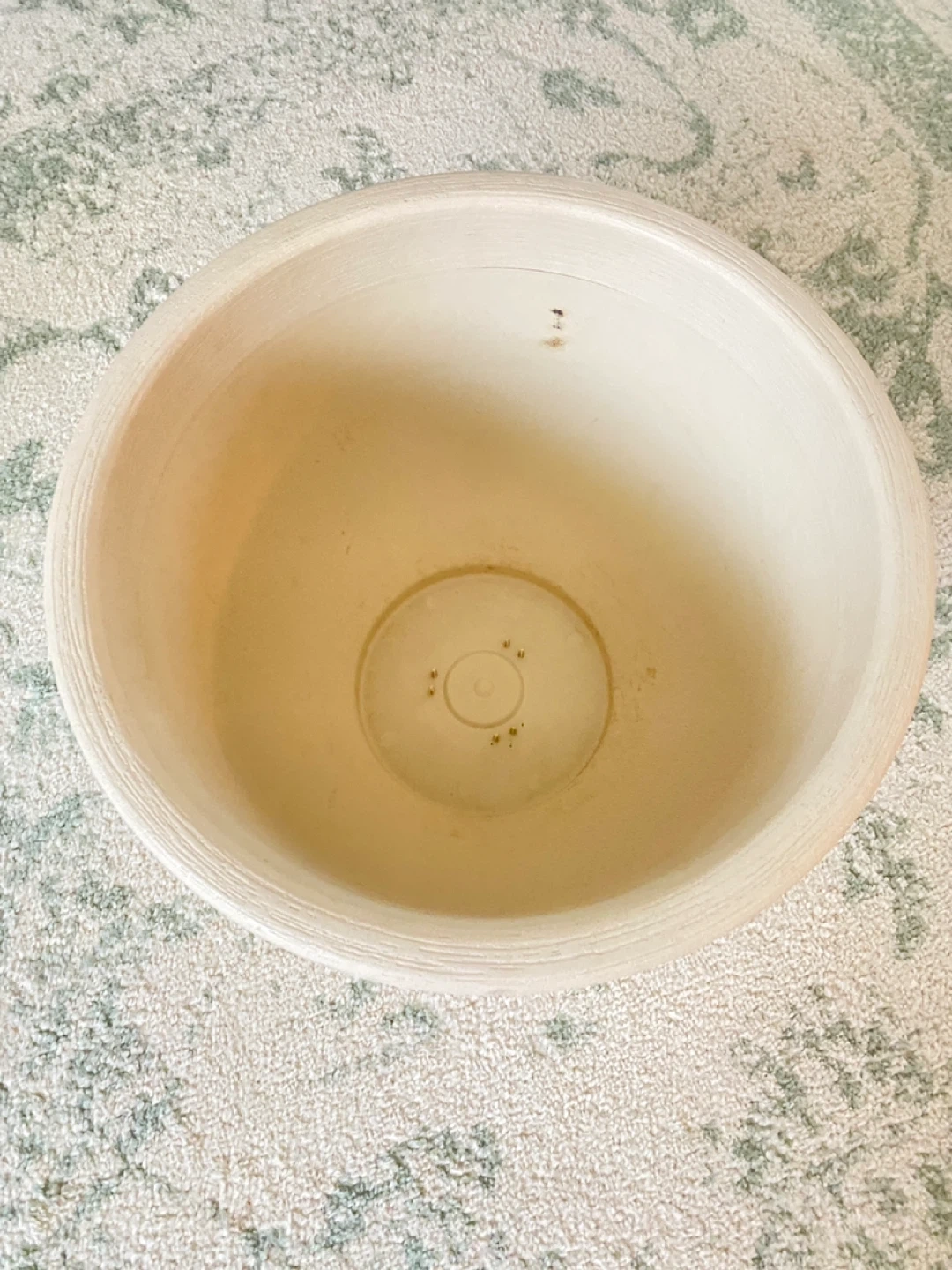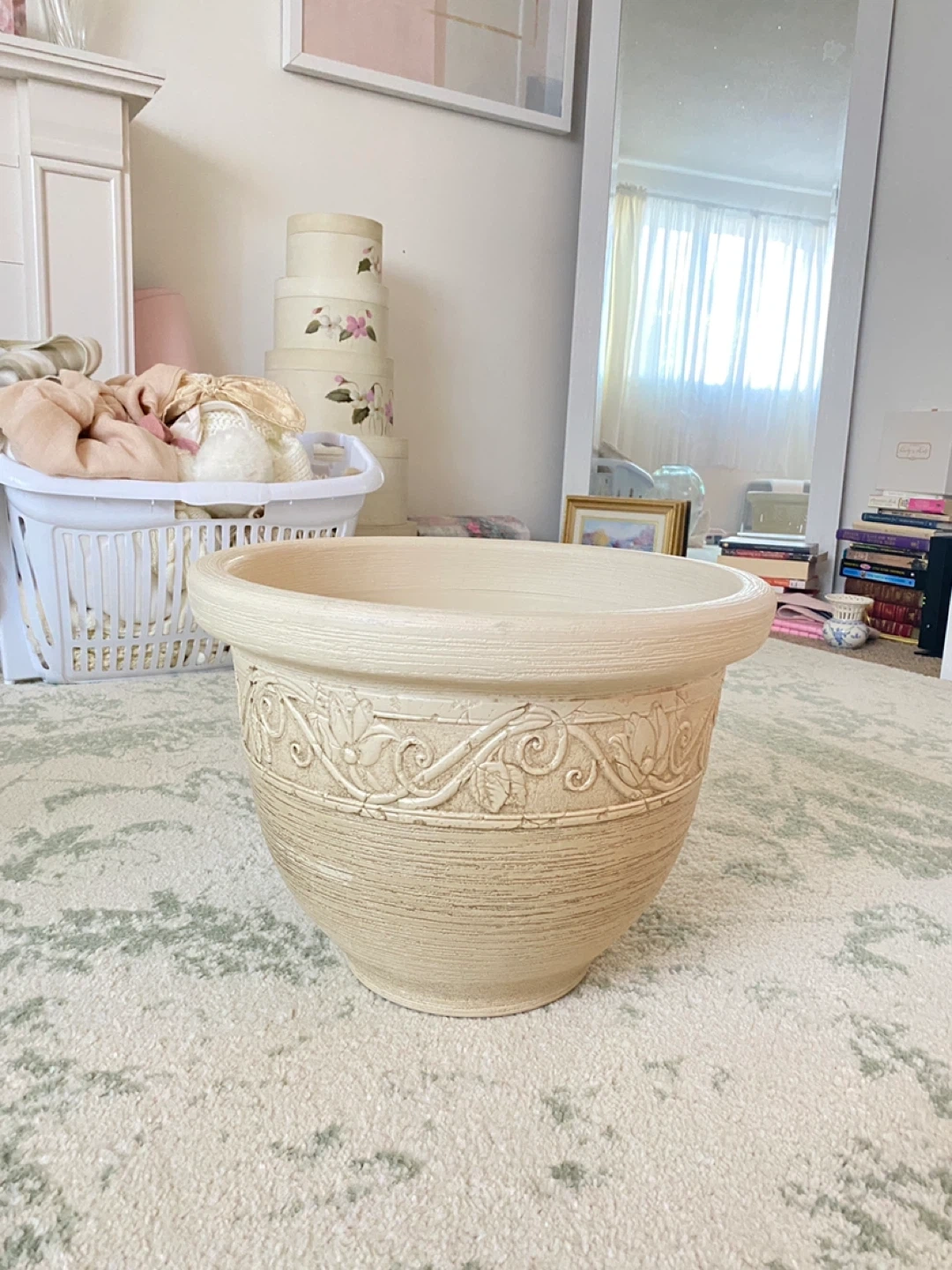 76Selling a large garden pot in beige. It has a beautiful design around the exterior. Perfect for a tree or large plant :)
