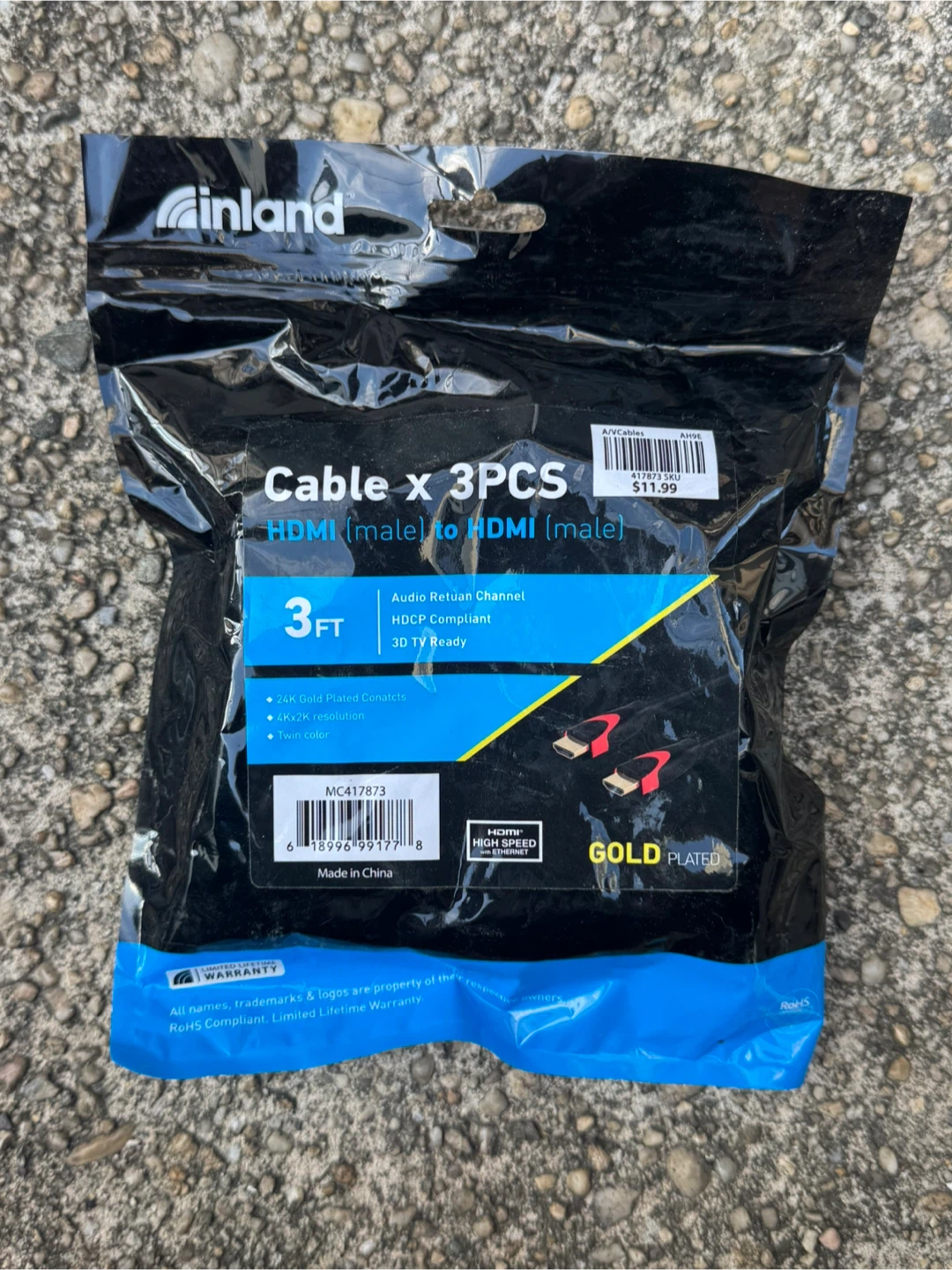 Selling a new 3-pack of Inland HDMI cables, each 3 feet long. These cables feature gold-plated contacts, support 4K/12K resolution, and have a new color. Originally bought for $11.99
