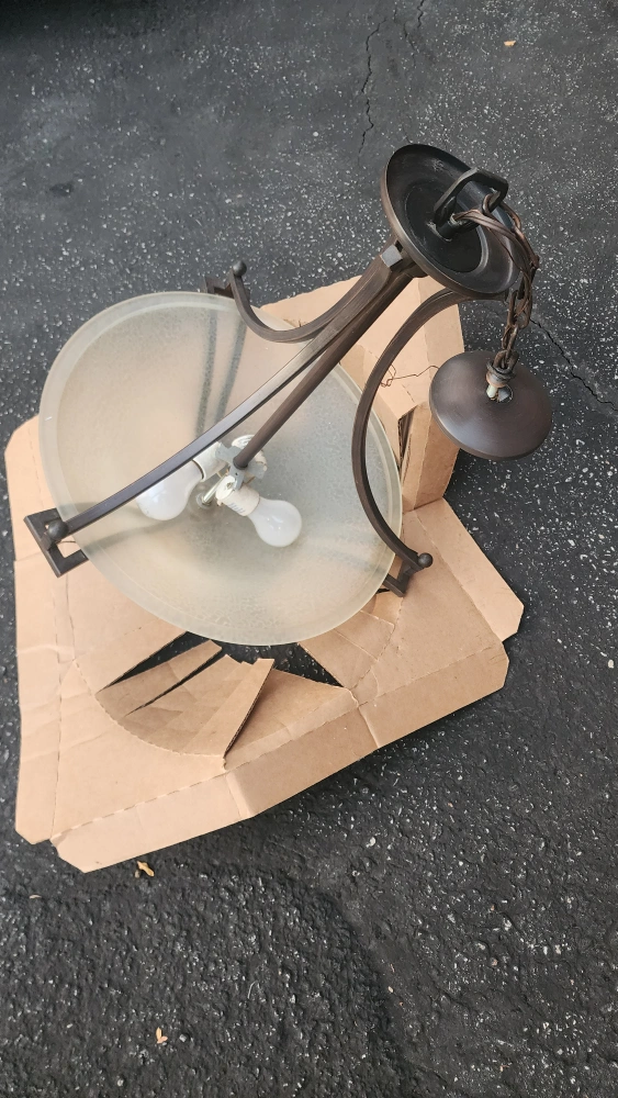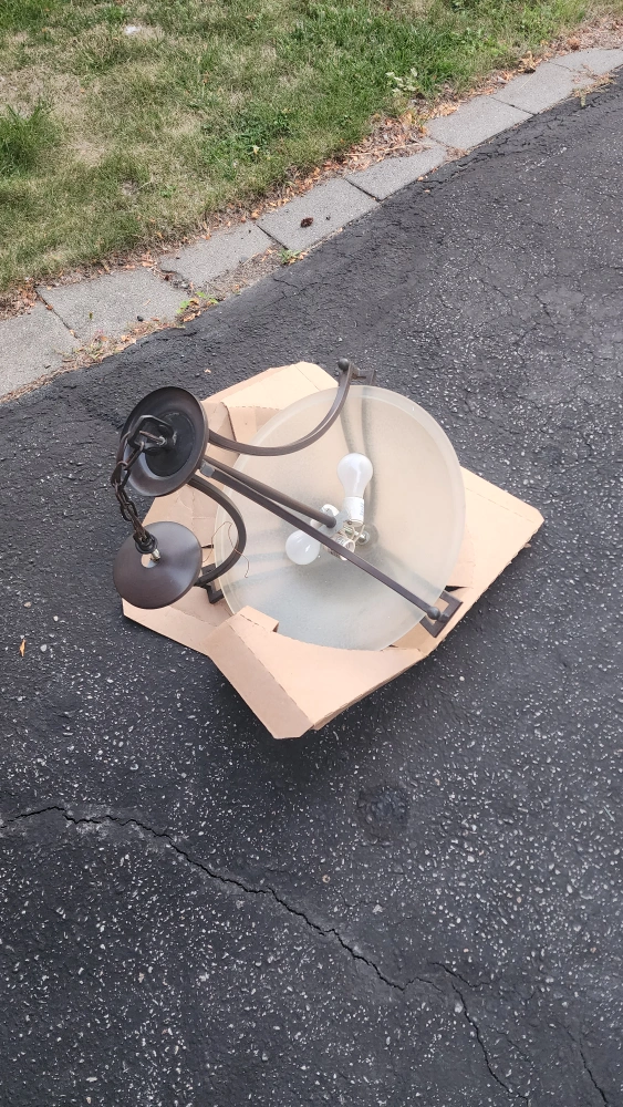 Selling a used hanging ceiling light fixture. It has a frosted glass shade and a bronze-colored metal frame. It's in good condition and ready to brighten up your space