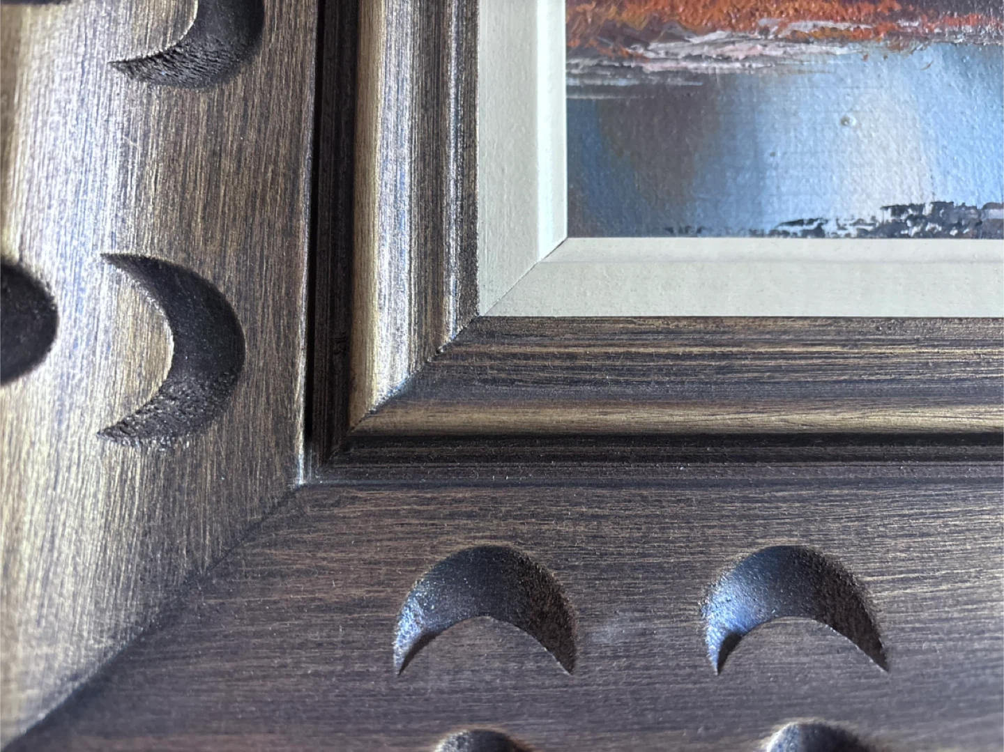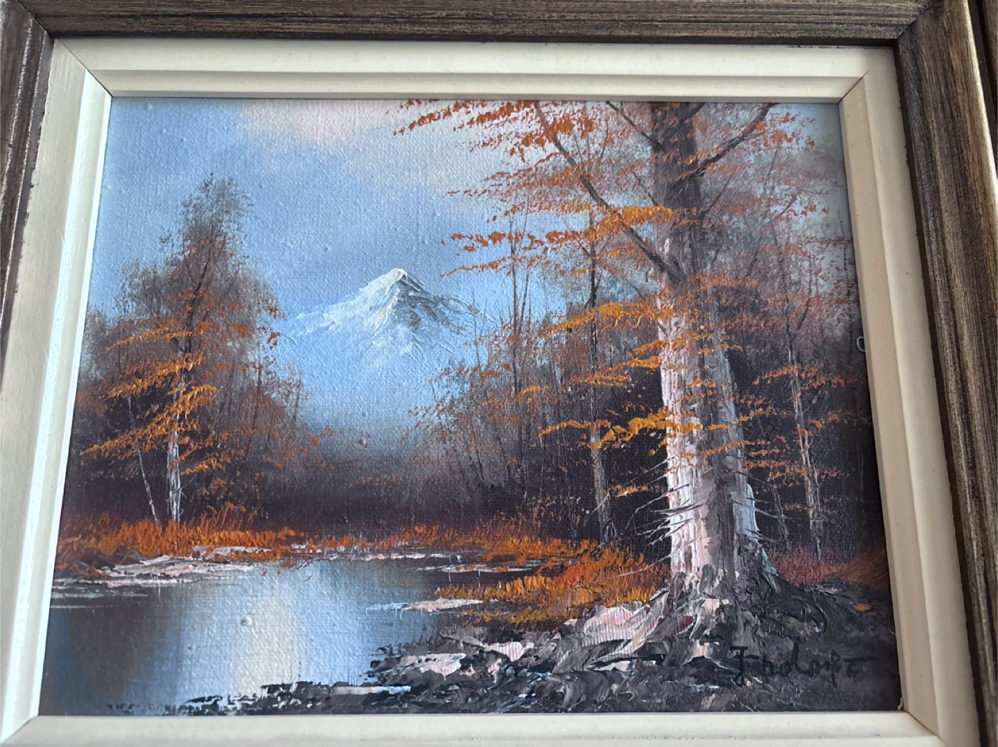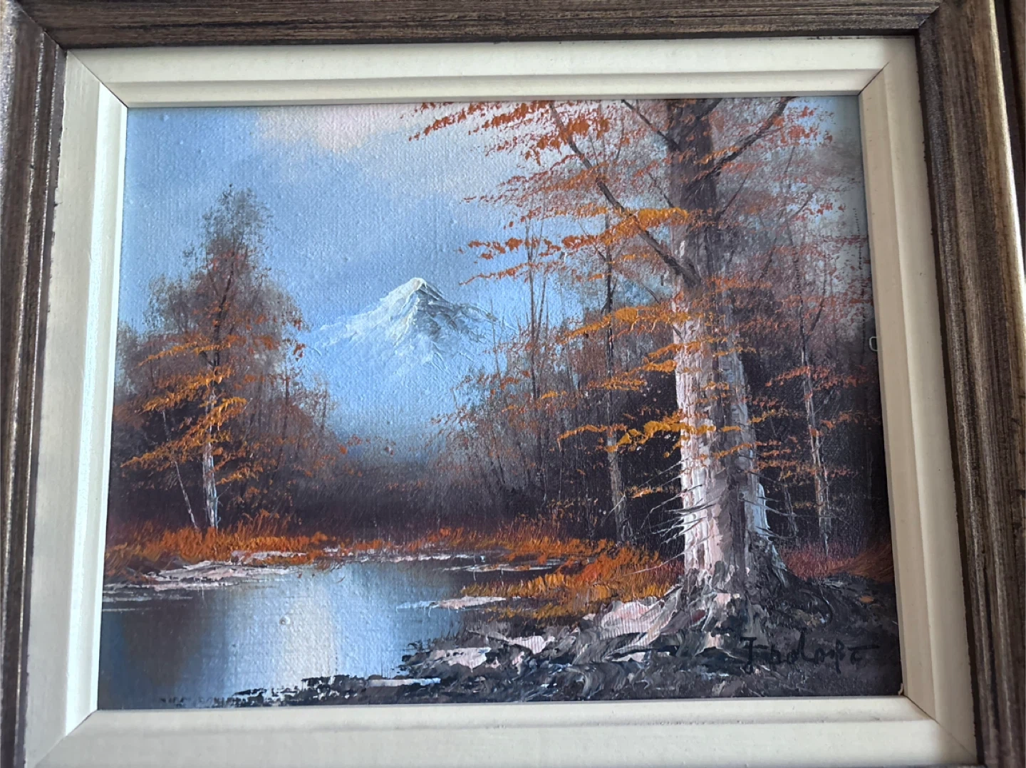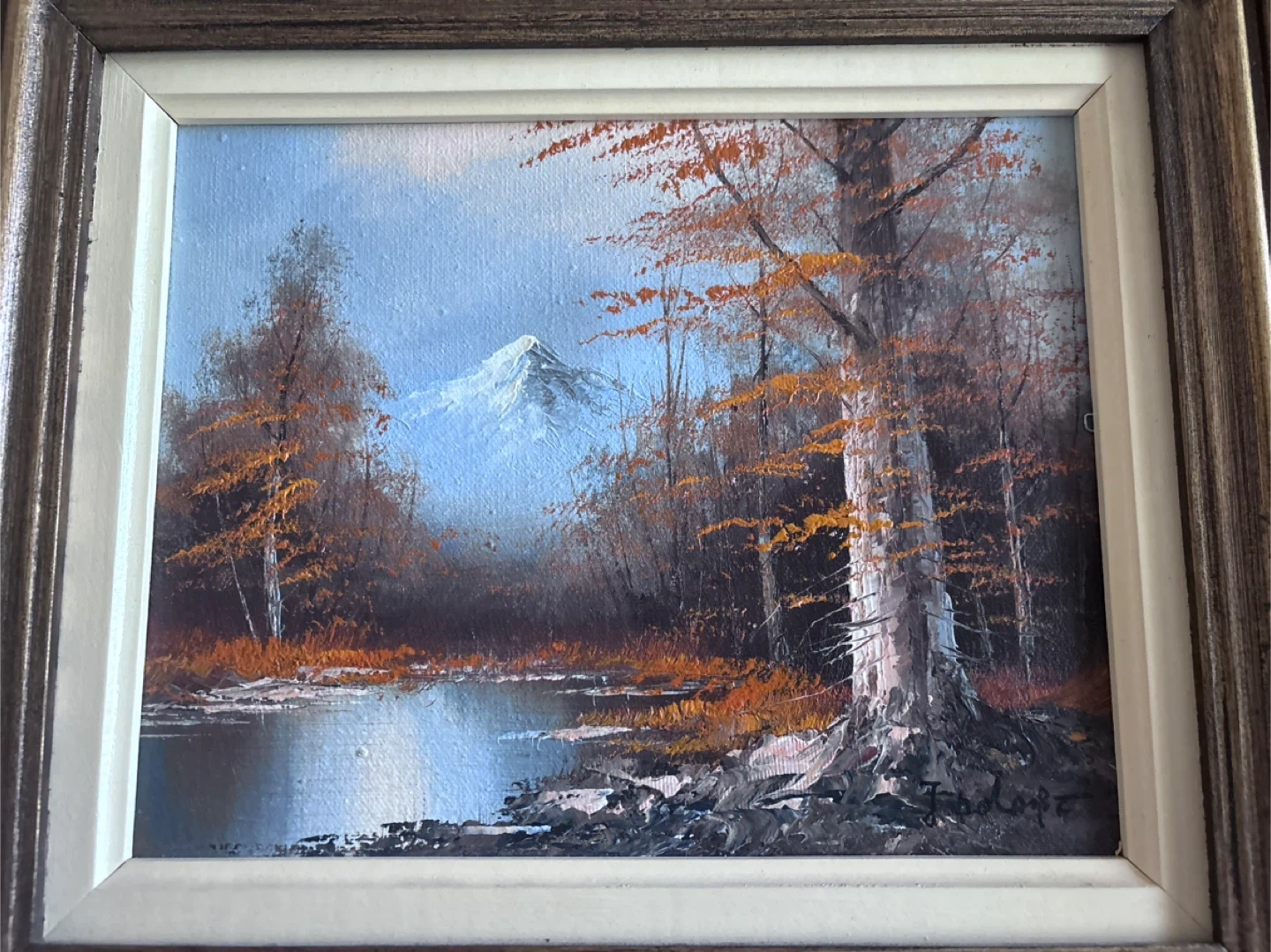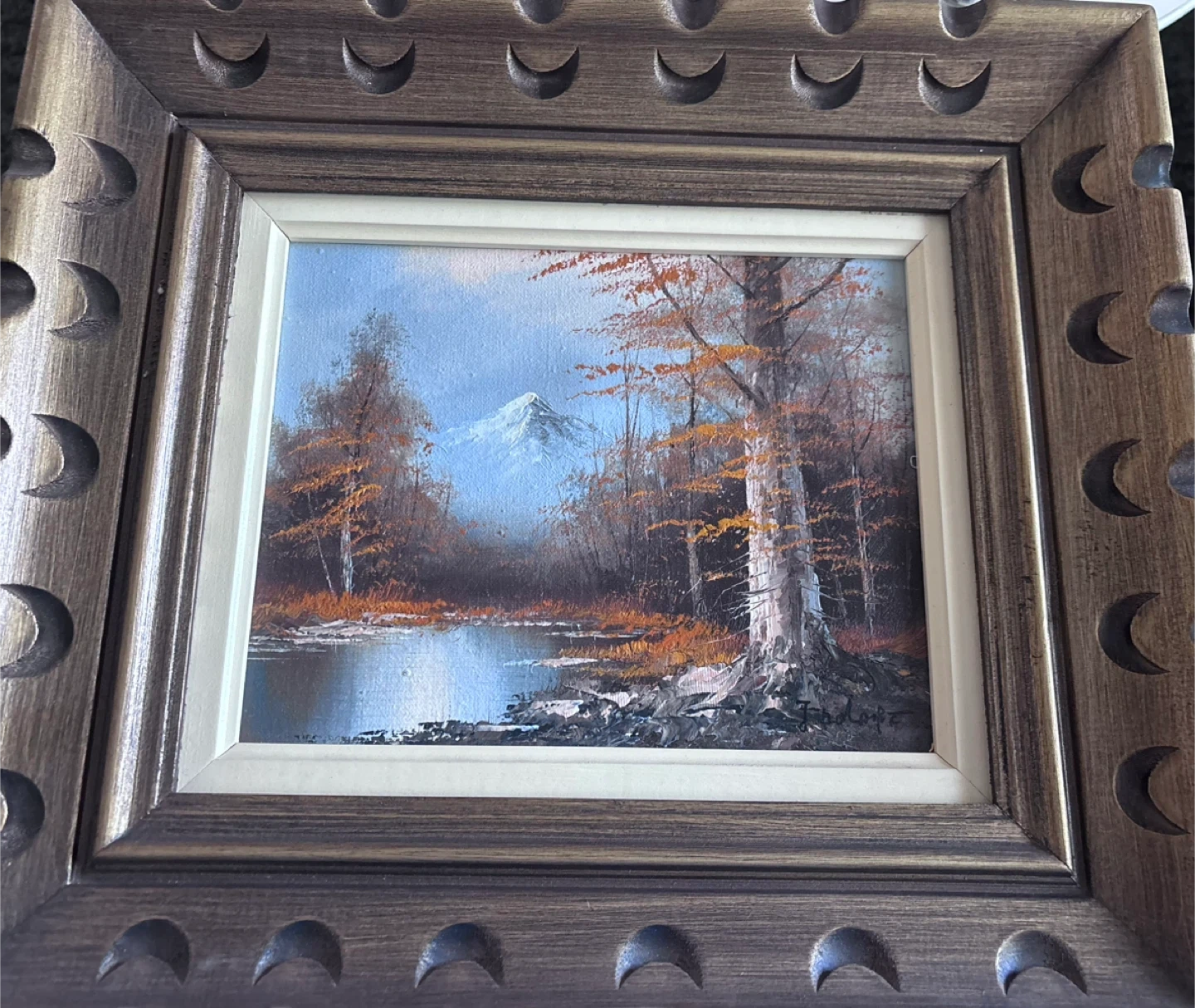 36A lovely framed painting of an autumn landscape! The frame has a unique, textured design that adds to its charm. The painting itself features a serene lake, trees with orange leaves, and a snow-capped mountain in the background. It's signed in the bottom right corner. Signature Unknown. A great piece to add some cozy vibes to your home