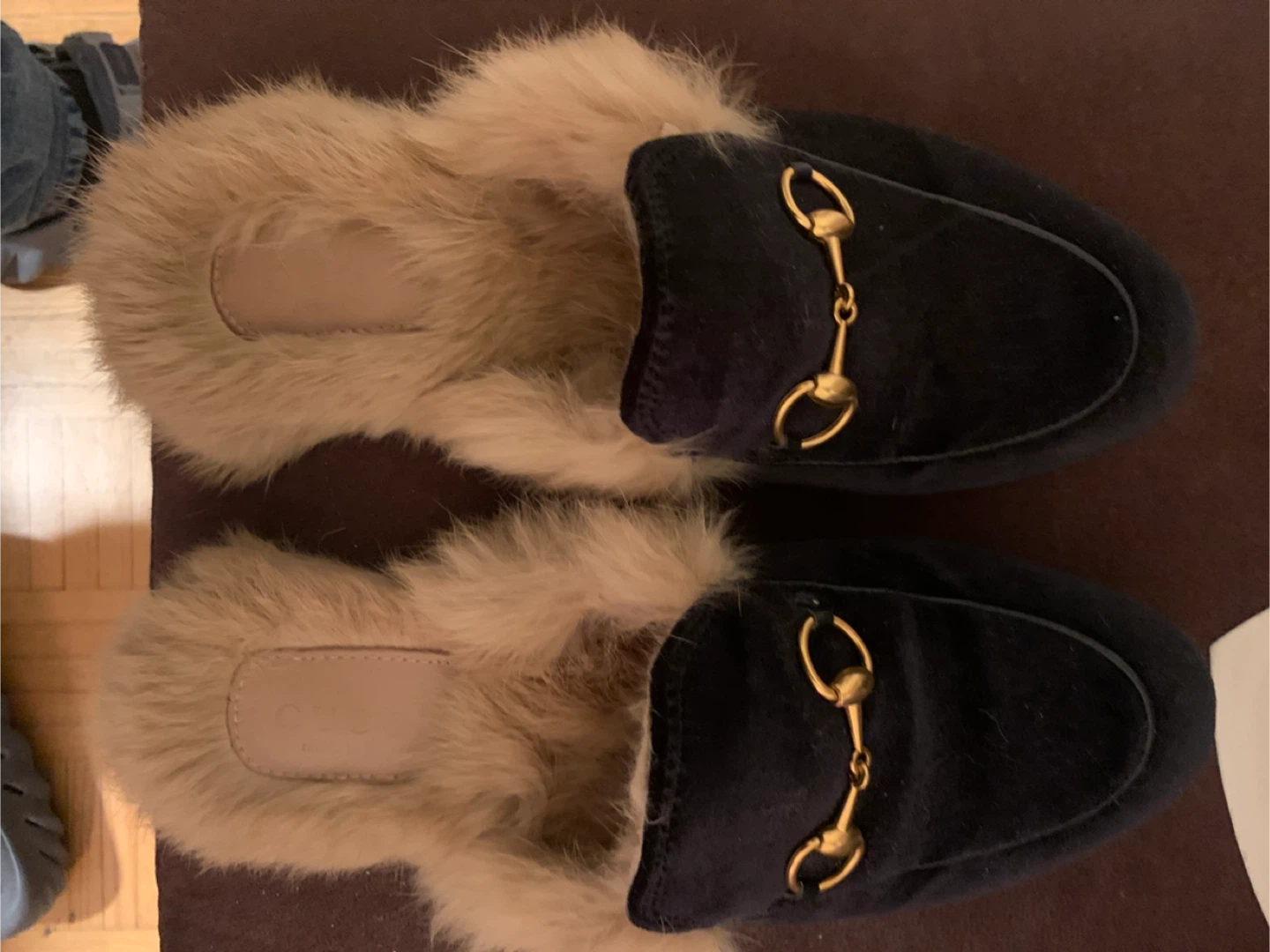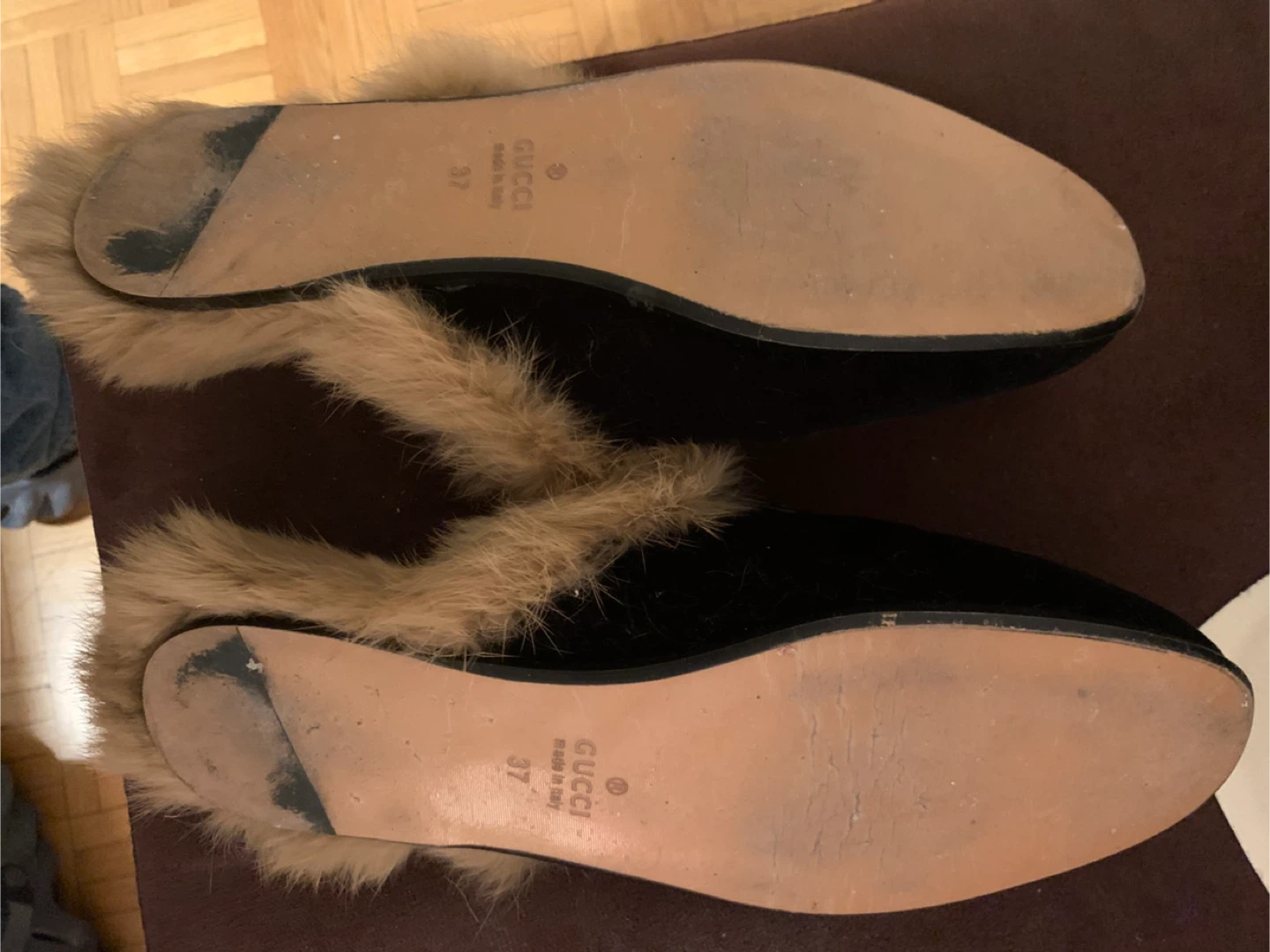 Selling a pair of Gucci Princetown mules! These are a size 37. They feature a black velvet upper and fur lining. The soles show some wear, but otherwise, they are in good condition. These are a stylish and comfortable choice!