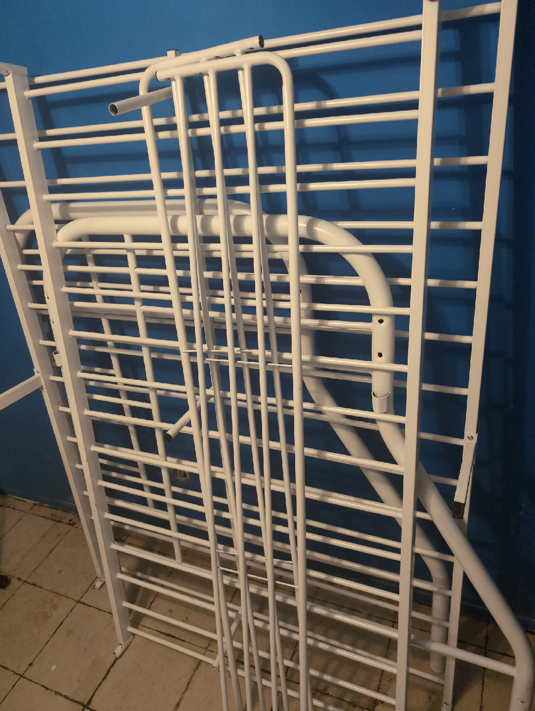 Selling a white metal bed frame. It's in good condition and ready for a new home! Perfect if you're looking for a simple and sturdy bed frame.