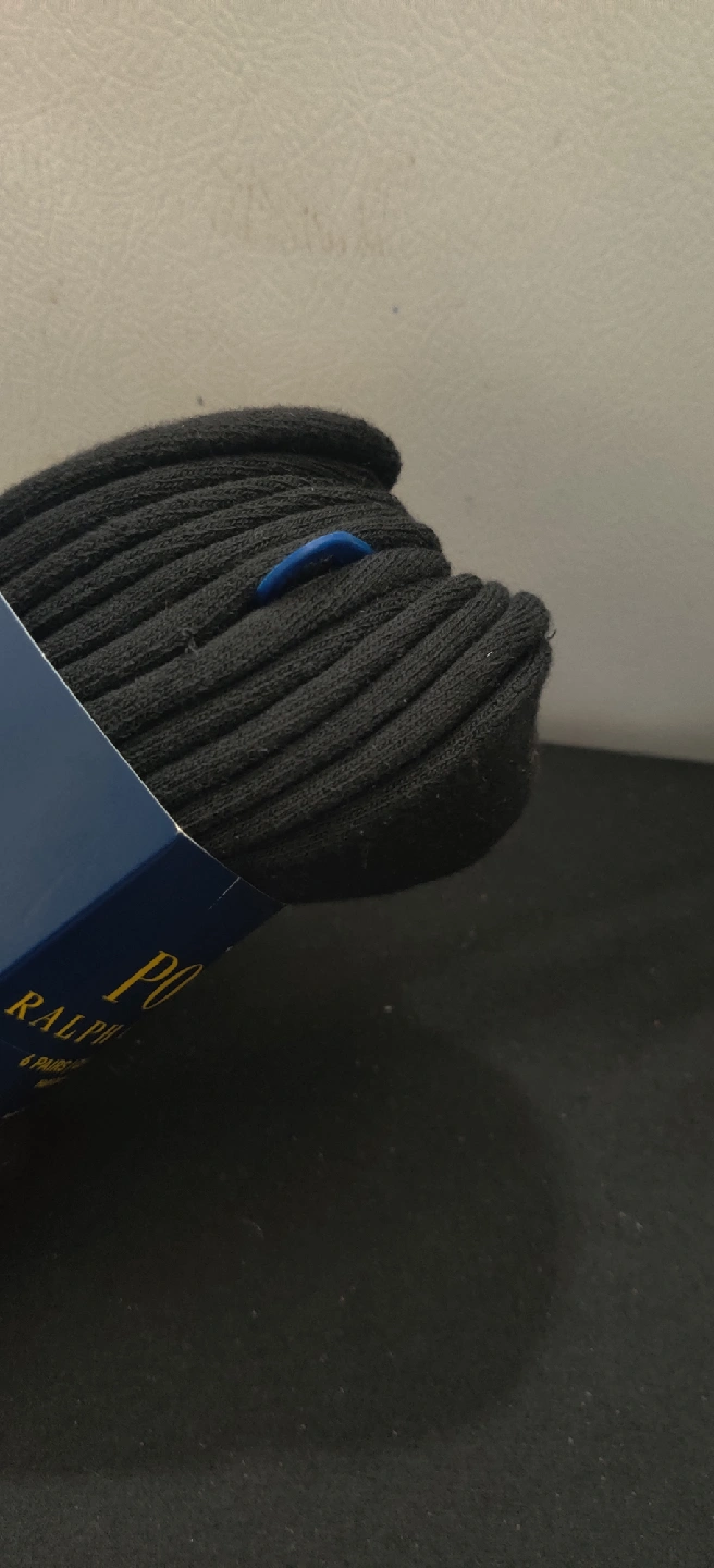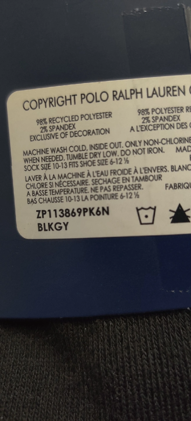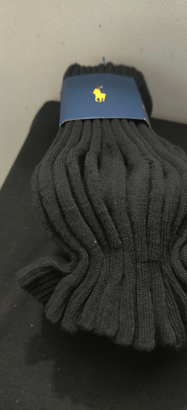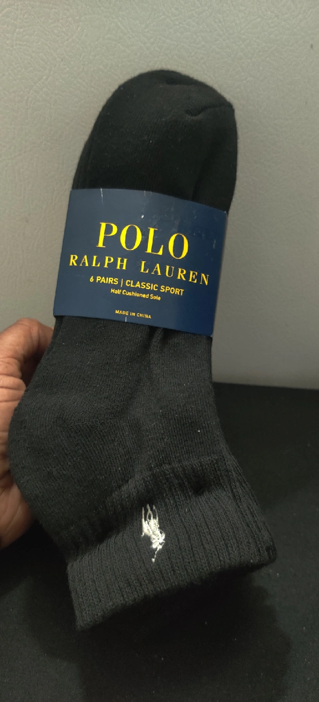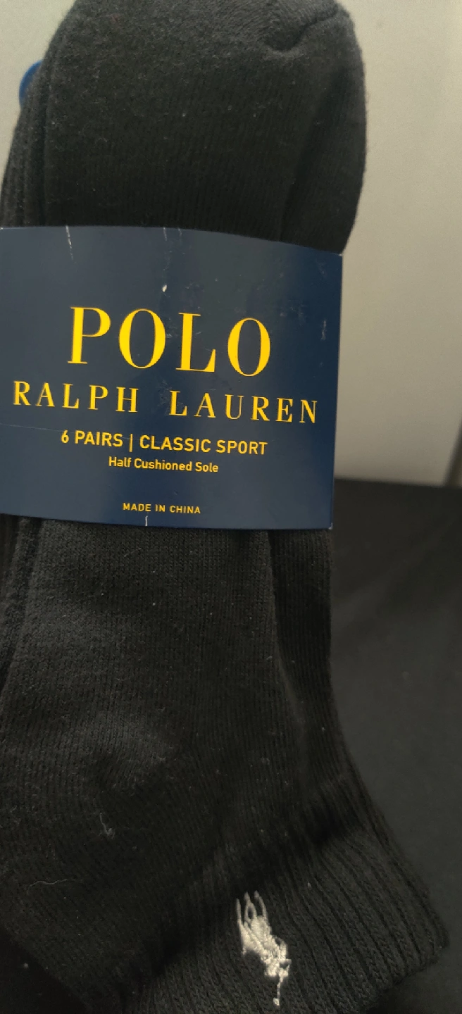 Selling a pack of Polo Ralph Lauren socks. These are classic sport socks, half cushioned sole. The pack includes 6 pairs of black socks. They fit shoe size 6-12½. Made of 98% recycled polyester and 2% spandex
