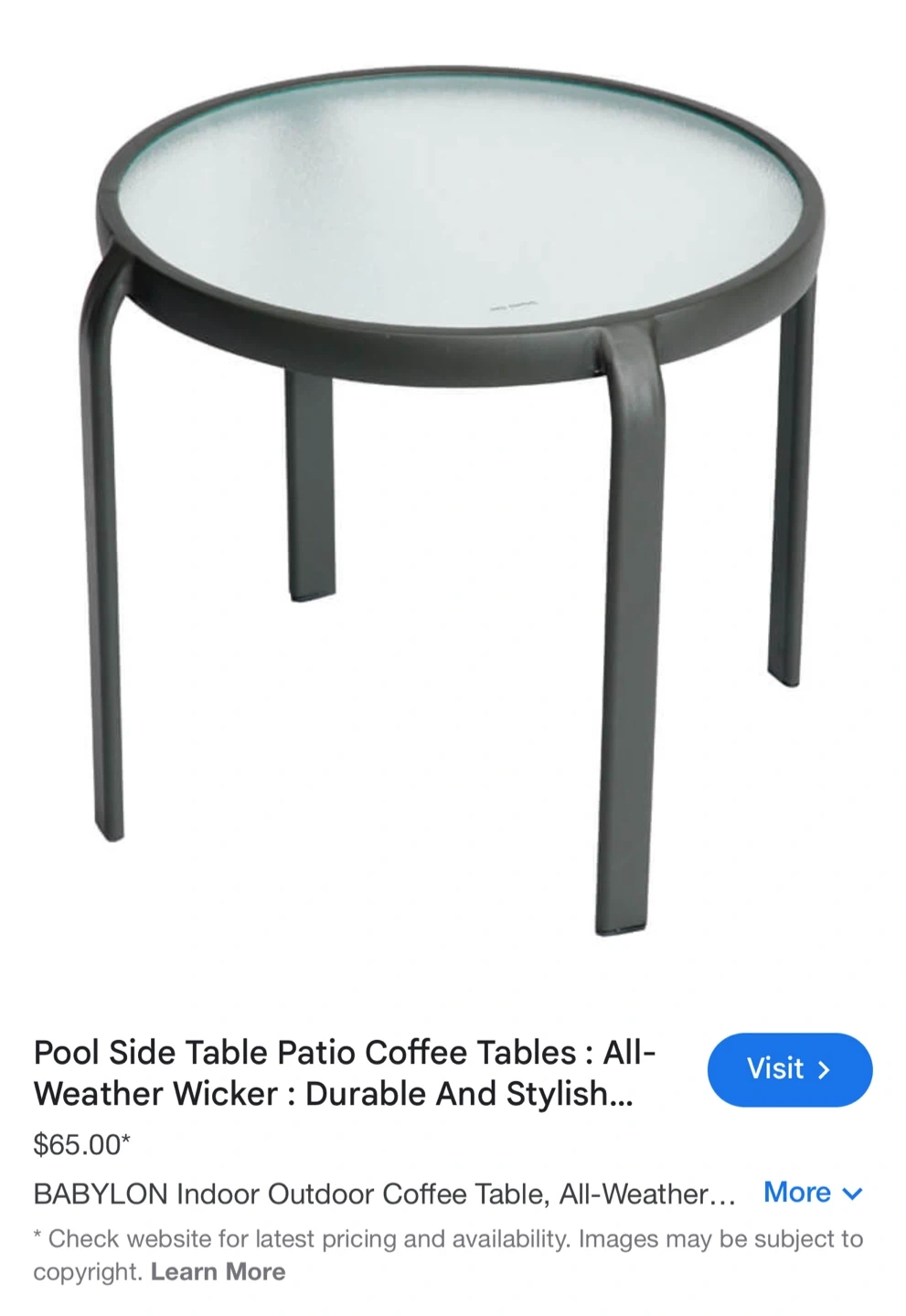 Selling a lovely BABYLON indoor/outdoor coffee table. It's all-weather, durable, and stylish, perfect for your patio or poolside! This coffee table is in great condition and ready to add a touch of elegance to your space. Originally was $65.