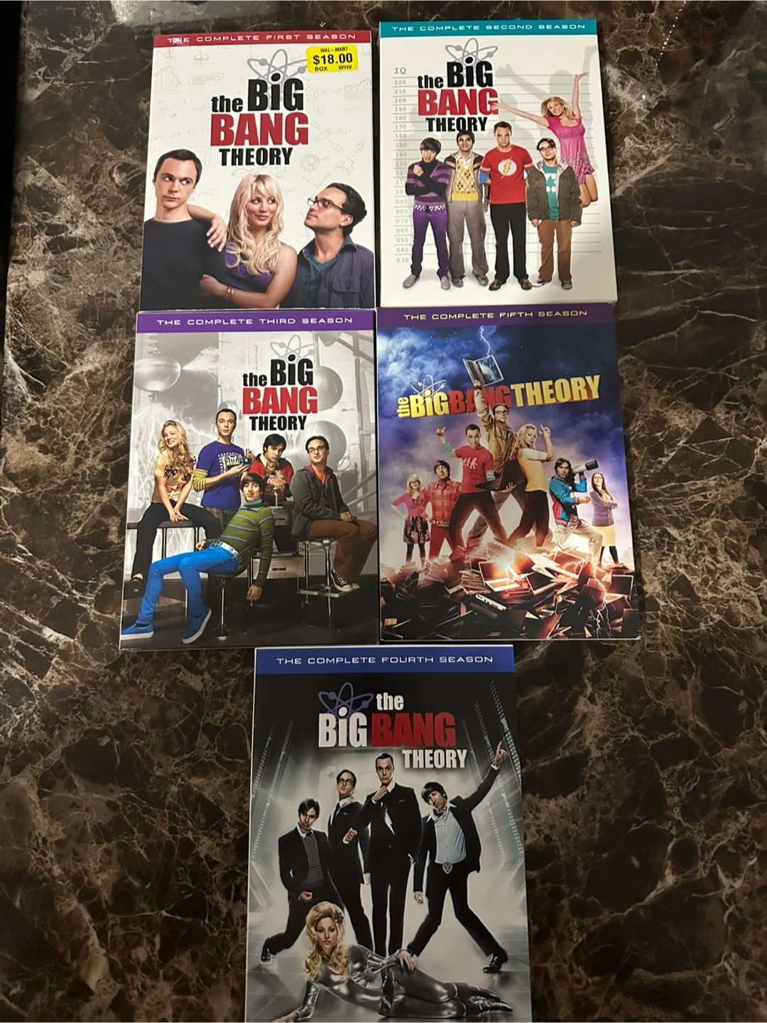 Selling the complete first five seasons of The Big Bang Theory on DVD! Get ready to binge-watch Sheldon, Leonard, Penny, and the gang in all their hilarious adventures. DVDs are in mint condition, shrink wrap has been removed but they have never been taken out of case or played. Smoke free home. Purchased for $18.00 each season.