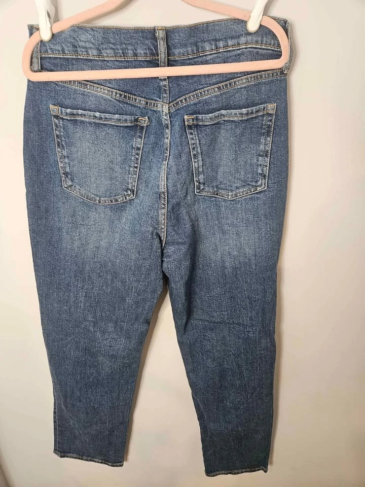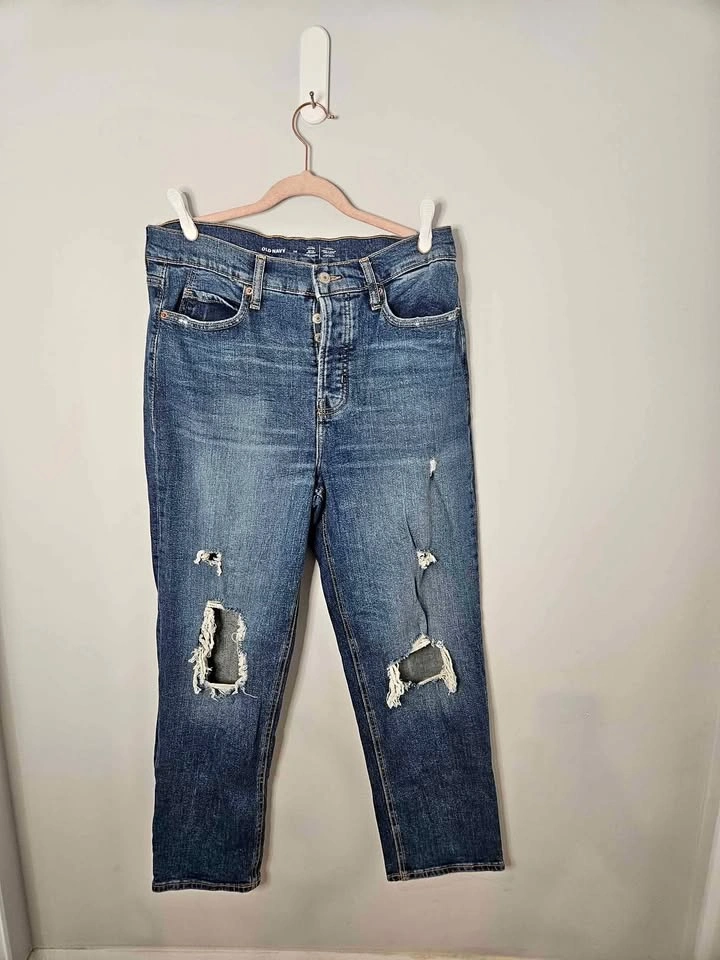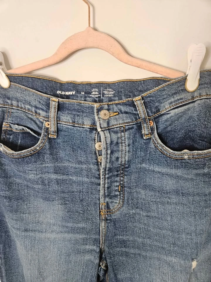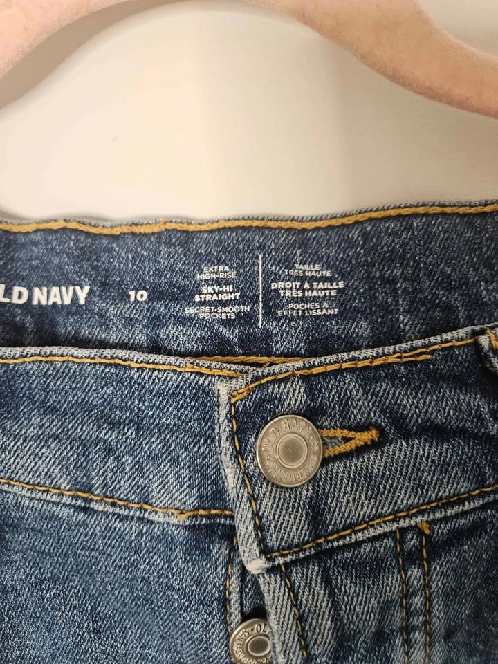 Button fly, extra high rise, and sky- hi straight distressed jeans in size 10. Old Navy