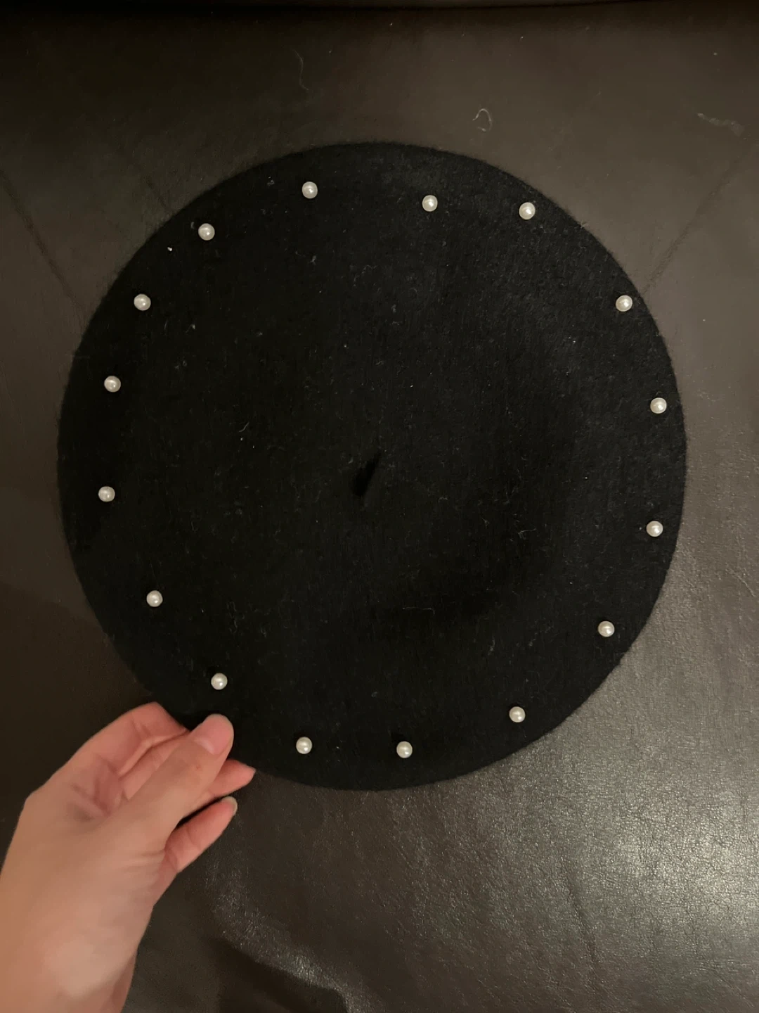 Selling a stylish black beret, adorned with delicate pearls! It's in great condition and perfect for adding a touch of elegance to any outfit