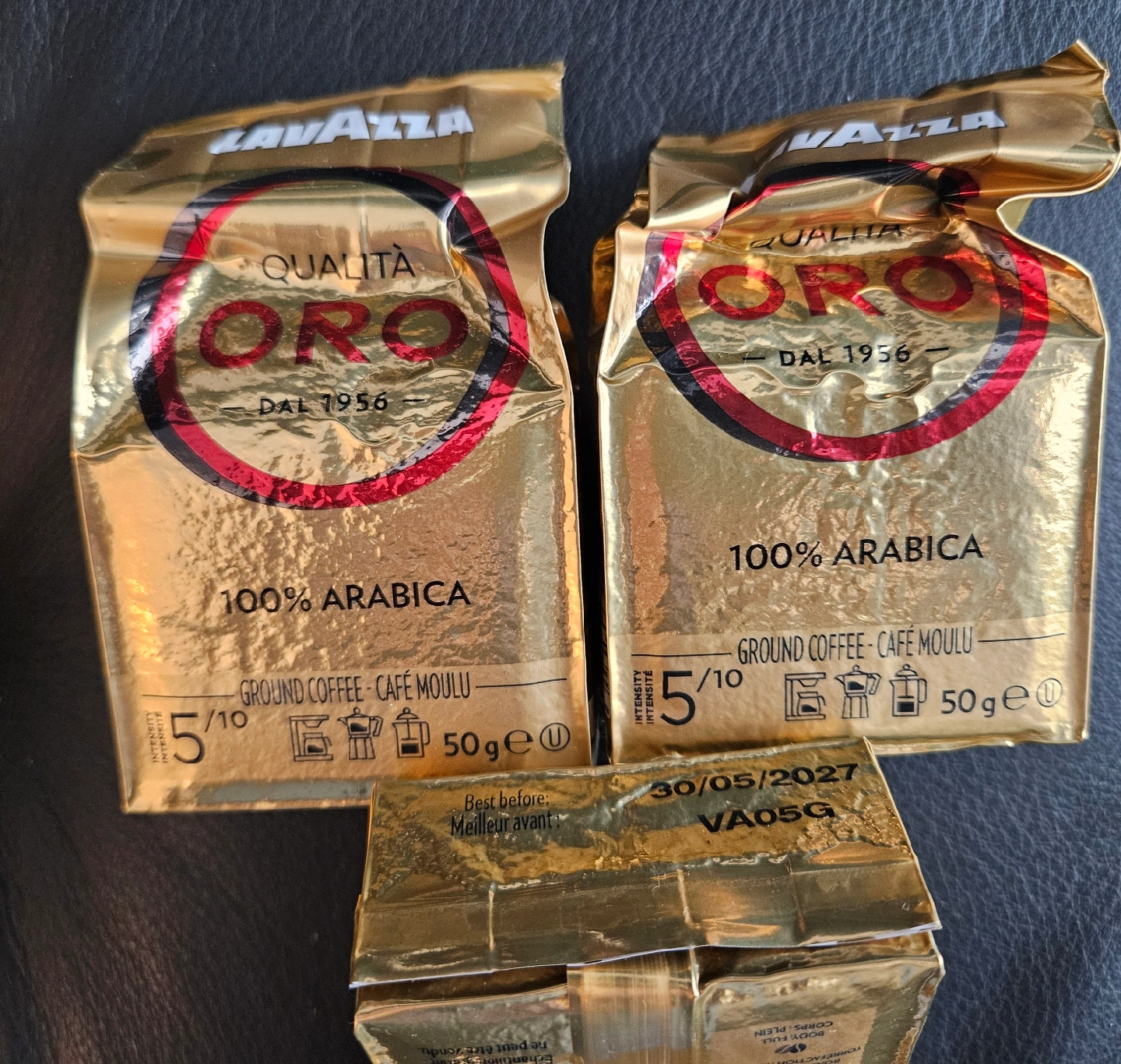 3 bags of Lavazza Qualita Oro ground coffee! These are 50g bags of 100% Arabica coffee, perfect for your morning brew. Best before May 30, 2027