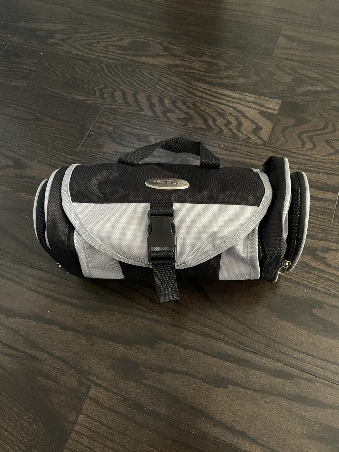 Selling a toiletry bag in black and grey. It's brand new never been used and perfect for travel or organizing your essentials! Has a handle on top and a buckle closure.