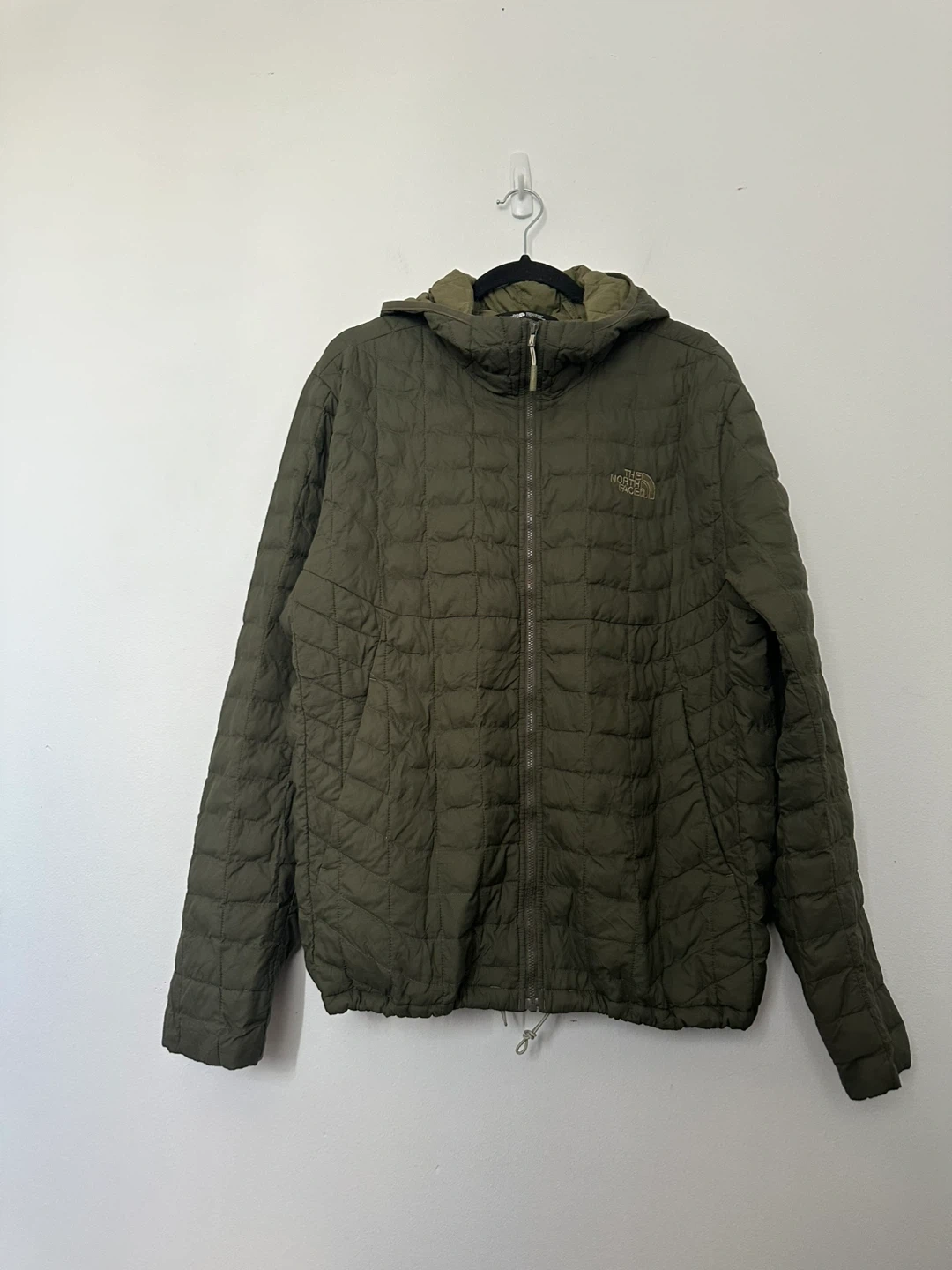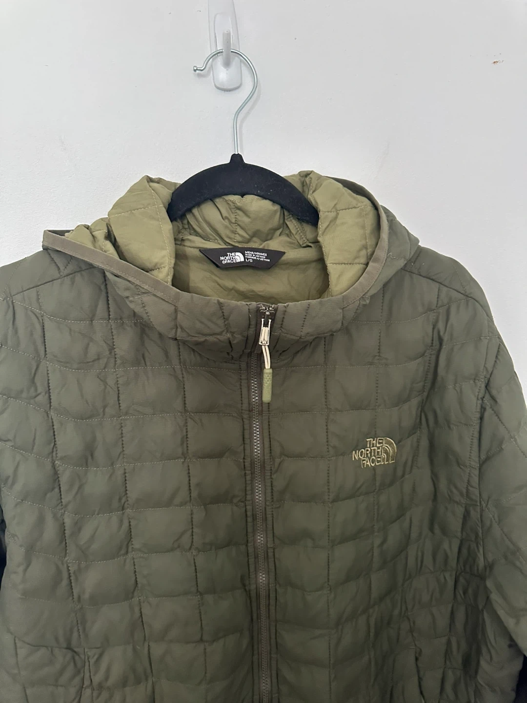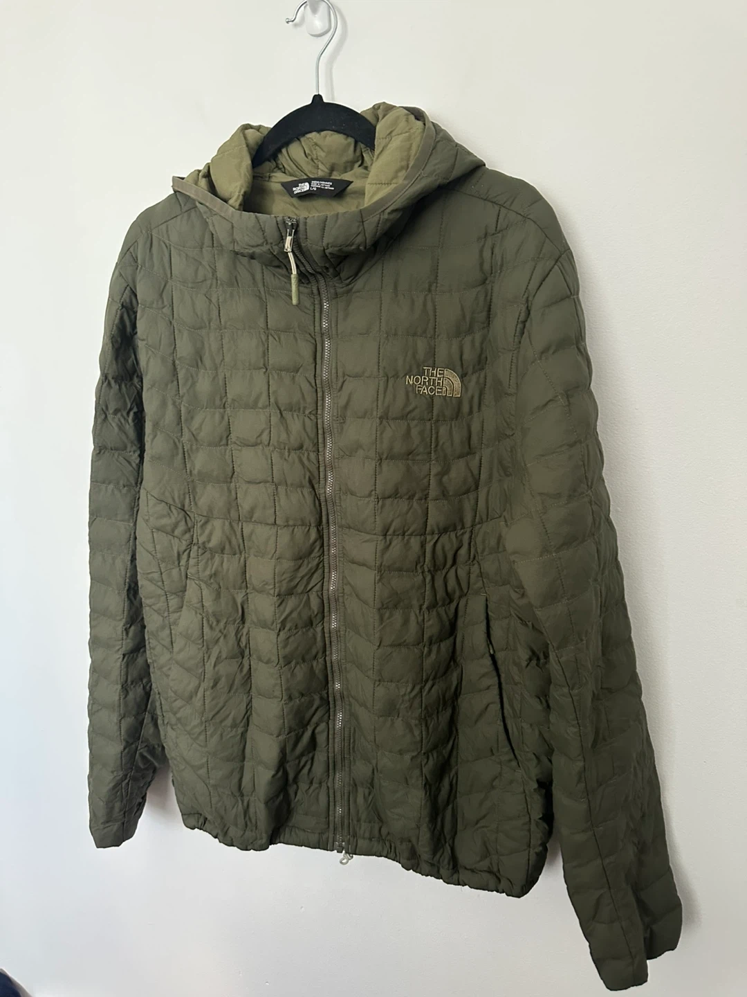 Selling a The North Face Thermoball jacket in a nice green colour. It's in great shape and ready for a new home! Perfect for layering or wearing on its own during those milder days. It's lightweight and packs down easily, making it great for travel or hiking. Lightweight and warm. Ideal for outdoor activities. The jacket has a drawstring bottom and a hidden pocket on the inside.