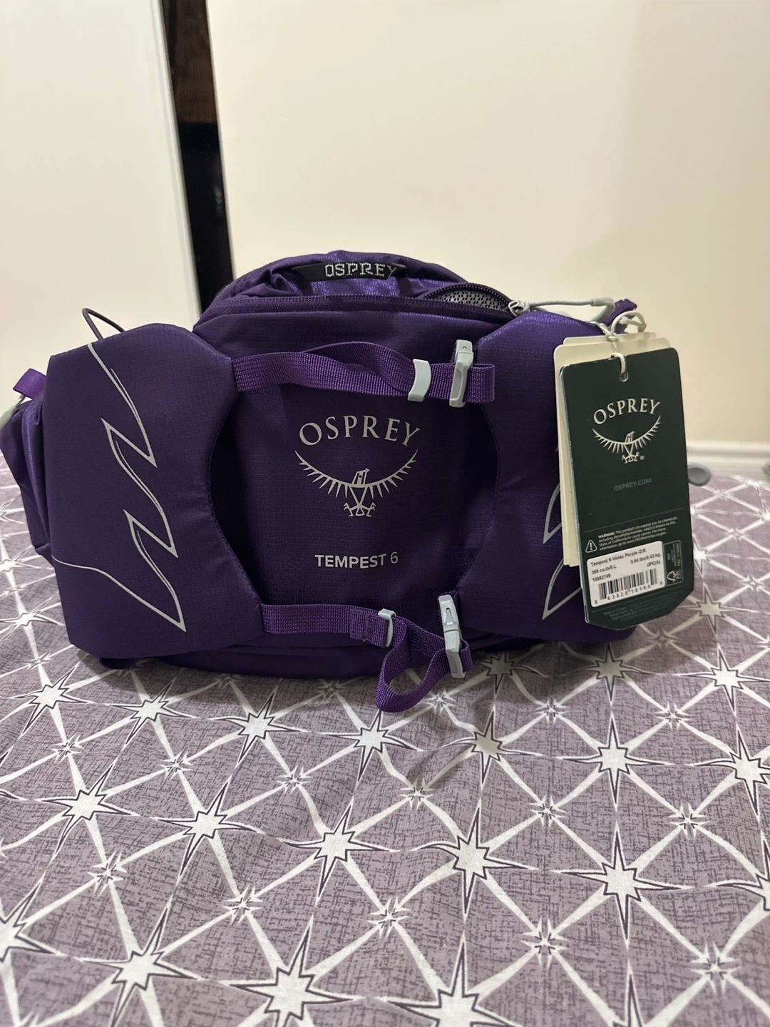 Selling a Brand New Osprey Tempest 6 waistpack in a beautiful violic purple colour! This waistpack is perfect for hiking, running, or just carrying your essentials hands-free. It's a size L.