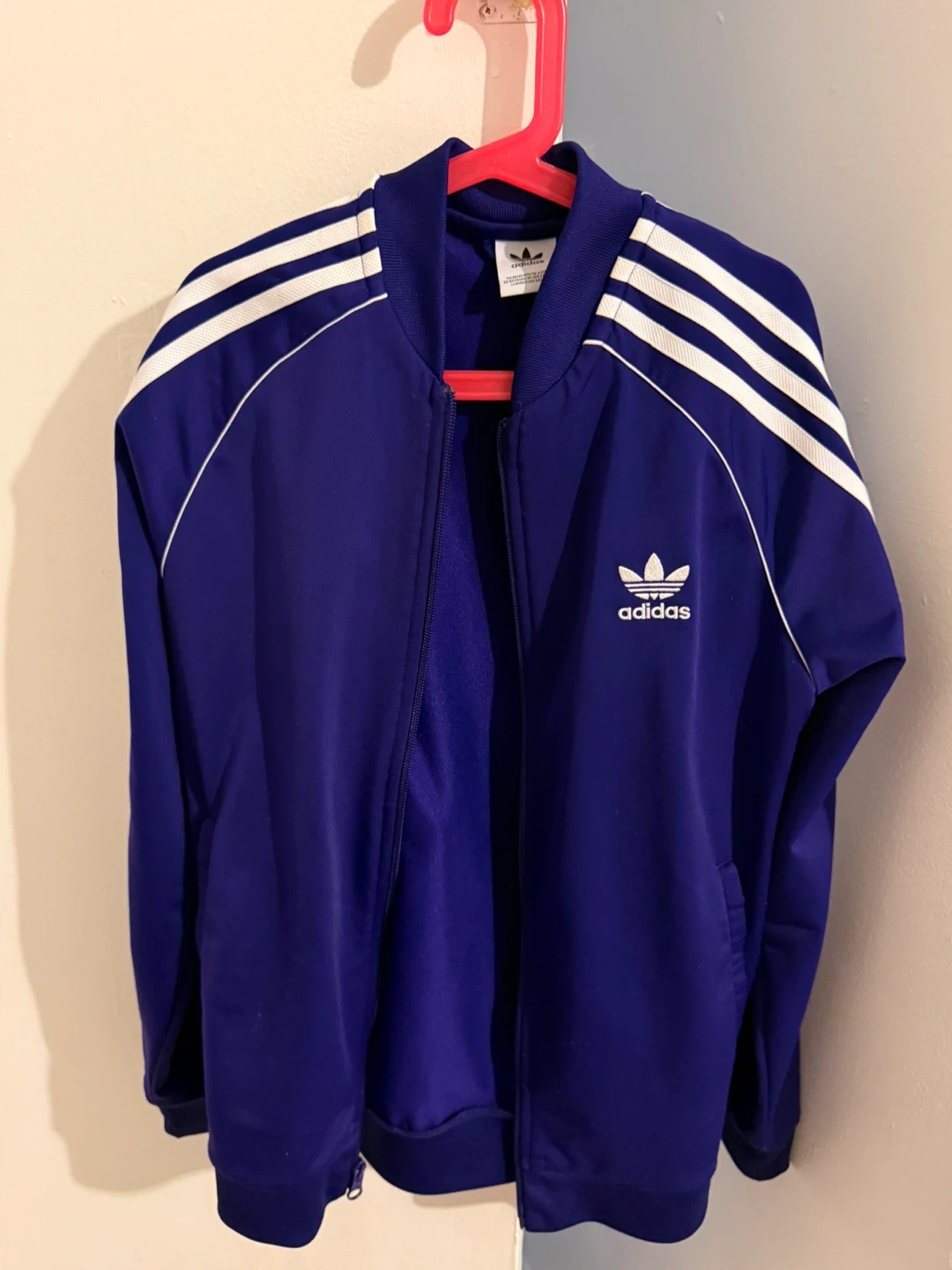 13Selling a purple and white Adidas tracksuit. It's in great condition and ready for a new home! The classic Adidas stripes add a sporty touch. Perfect for workouts or just lounging around!