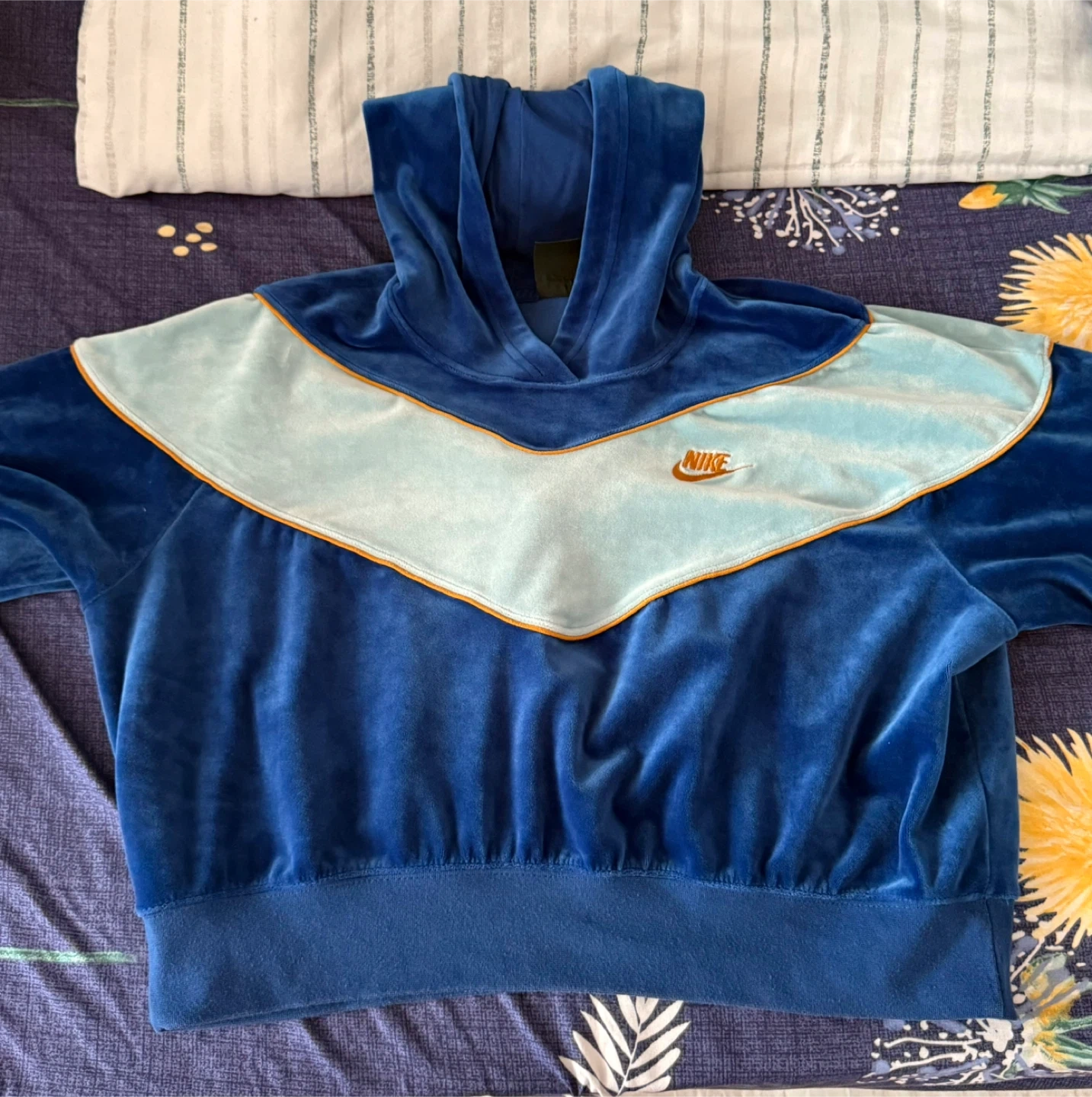 13Selling a comfy Nike velour tracksuit in blue! The set includes both the pants and the hoodie. Perfect for lounging or casual wear. The material is soft and plush, making it super cozy.