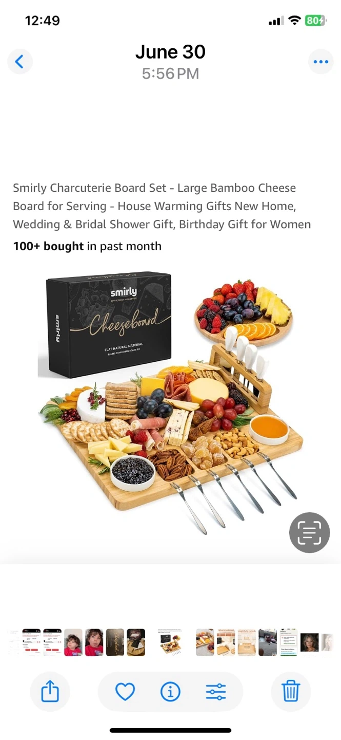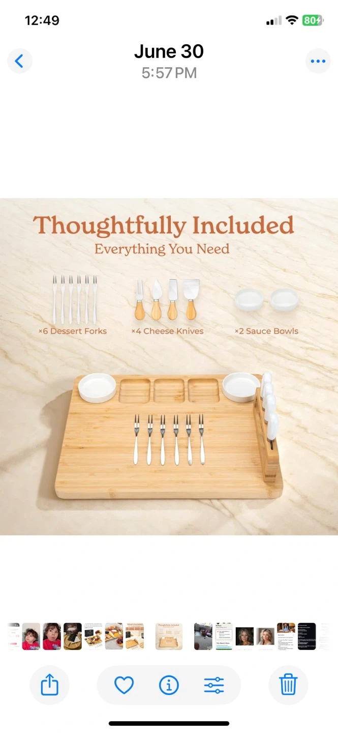 Selling a Smirly Charcuterie Board Set. It's a large bamboo cheese board. The set includes a fruit tray, ceramic bowls, chalk markers, a packaging box, slate labels, cheese knives, a cheese guide, and the cheese board itself. Also included are dessert forks and sauce bowls. It comes with the original box