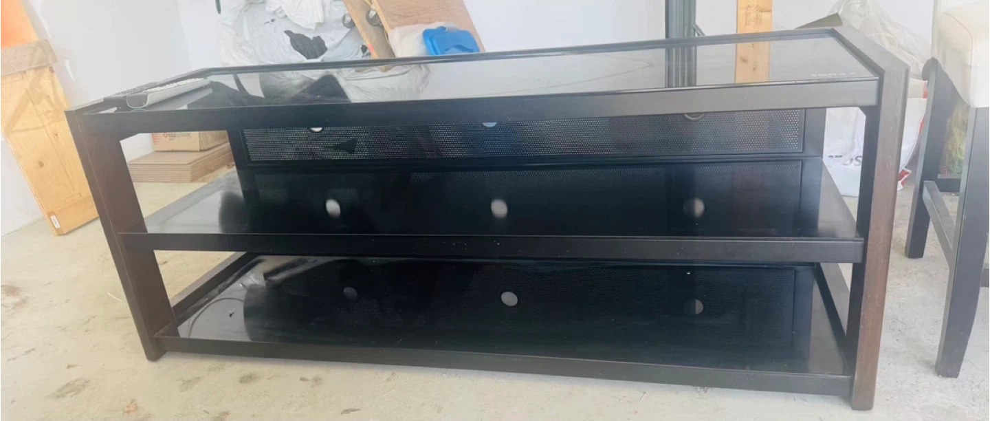 Selling a black TV stand with a glass top. It features open shelving and a mesh-covered section, providing ample storage and ventilation for your media devices. Great for organizing your entertainment setup!