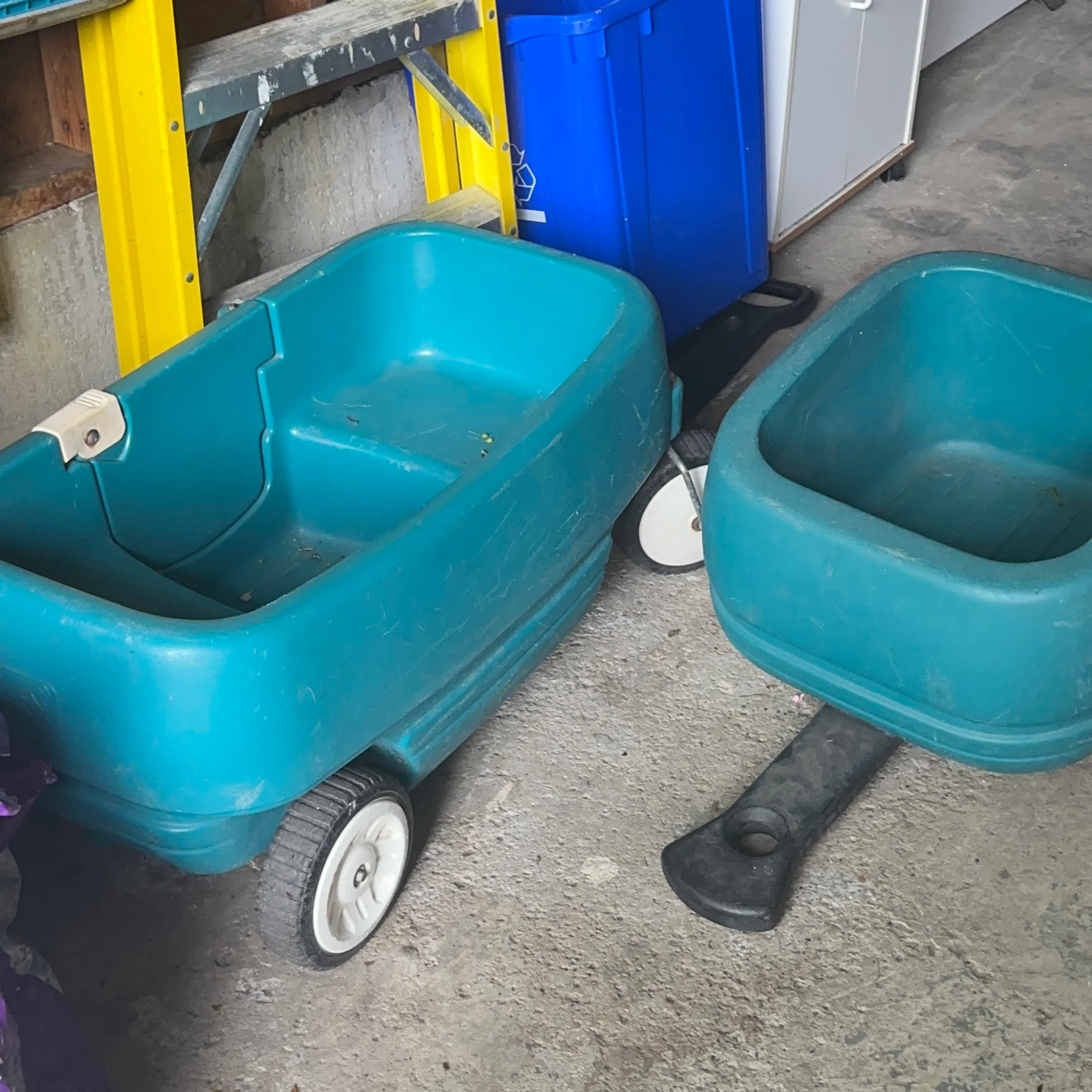 Selling a turquoise plastic wagon. It's in used condition, with some wear and tear, but still functional. Great for hauling things around the yard or garden!