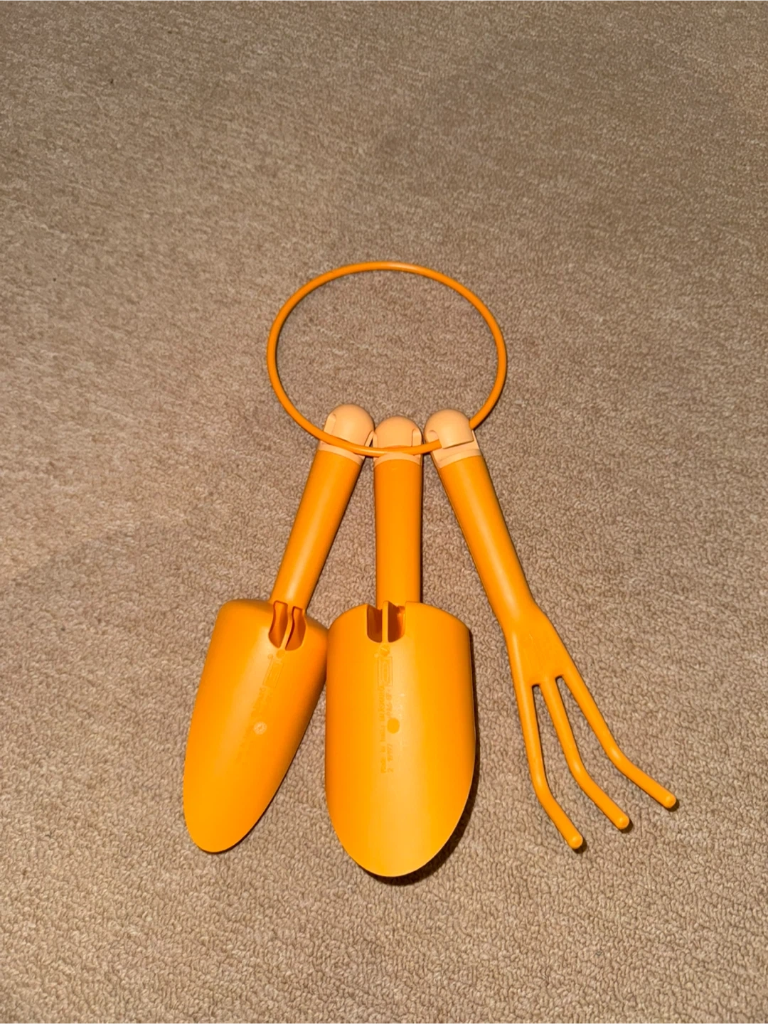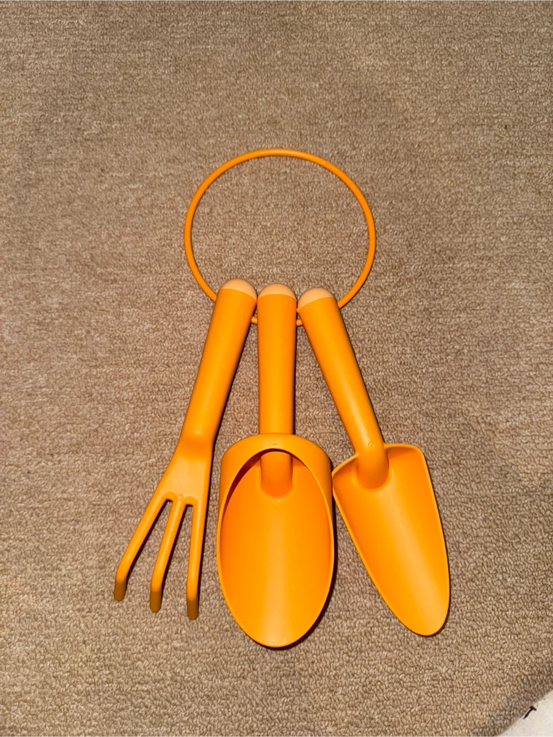 Check out this cute little garden tool set for kids! It includes a small shovel, spade, and rake, all in a bright orange colour. Perfect for helping out in the garden or playing in the sand $5