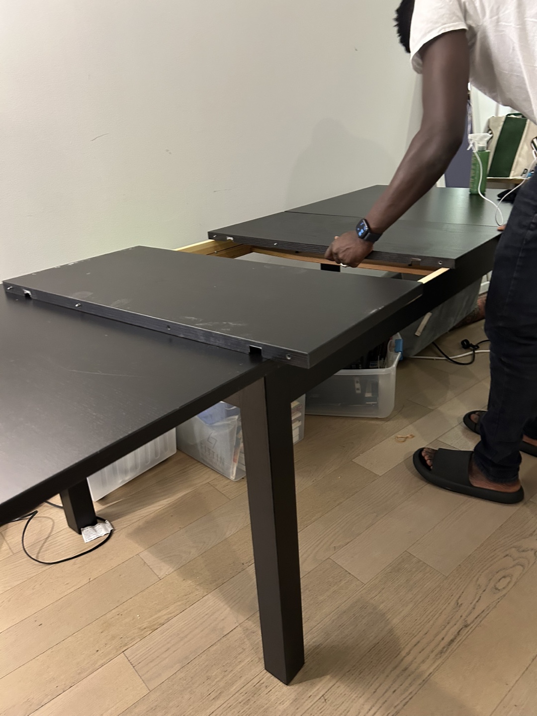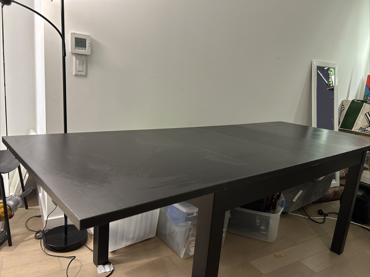 Table in overall good condition with few minor scratches. Really great for small apt spaces while still having the option of opening up to a larger table for hosting dinner parties / entertaining gatherings.