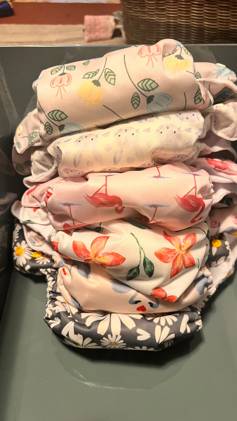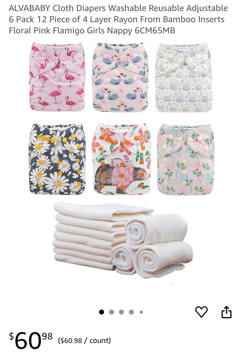 Selling a set of ALVABABY cloth diapers with washable, reusable, and adjustable features. They come with 4-layer rayon bamboo inserts. The diapers have cute floral, flamingo, and daisy patterns. Originally bought for $60.98
