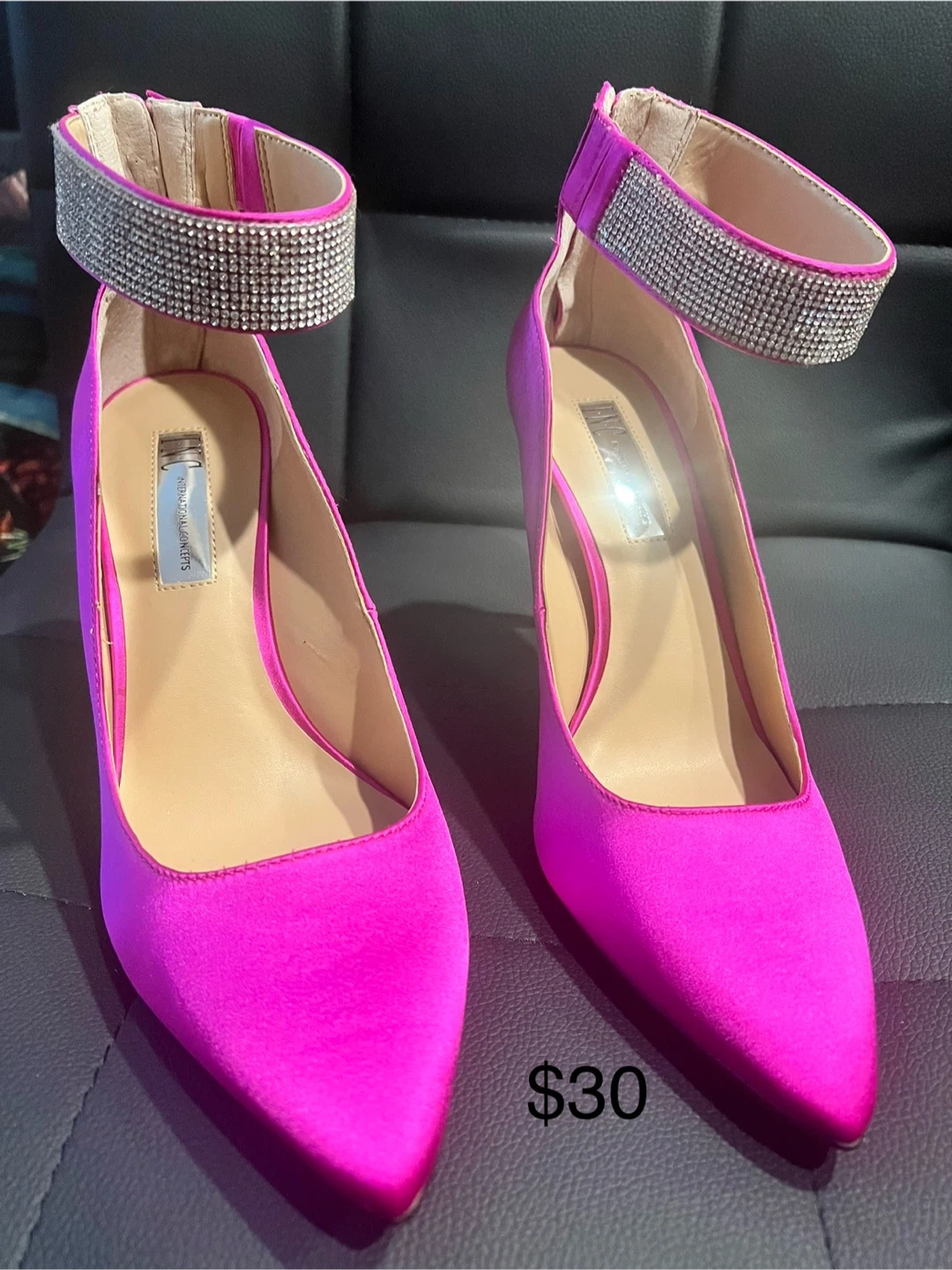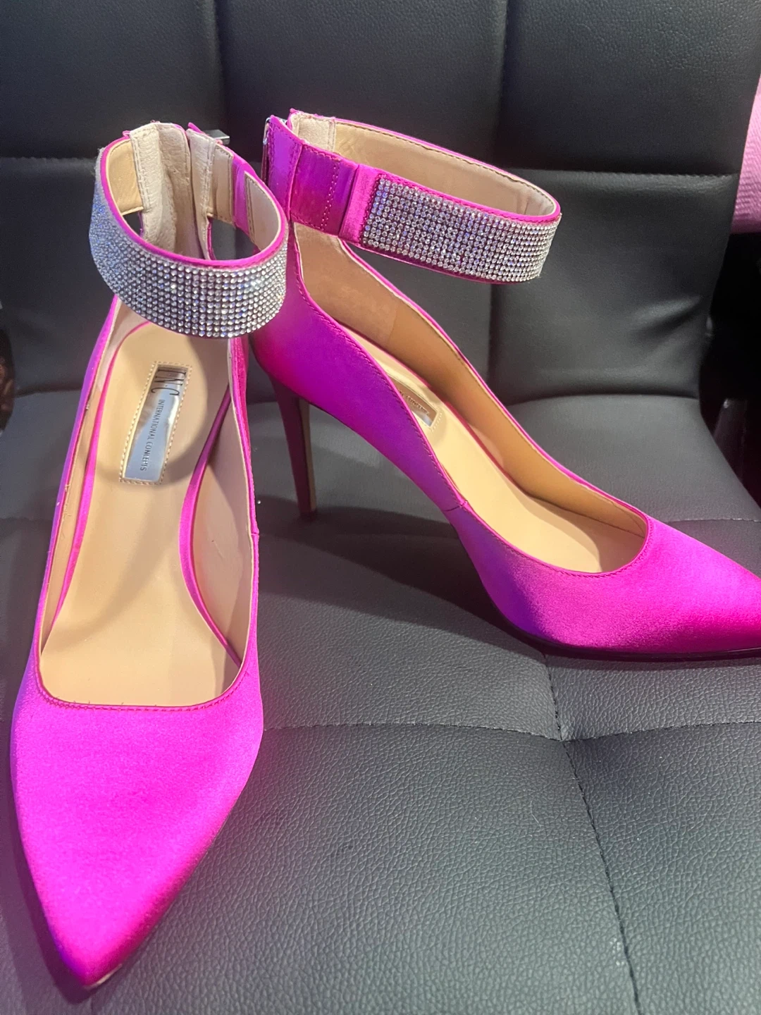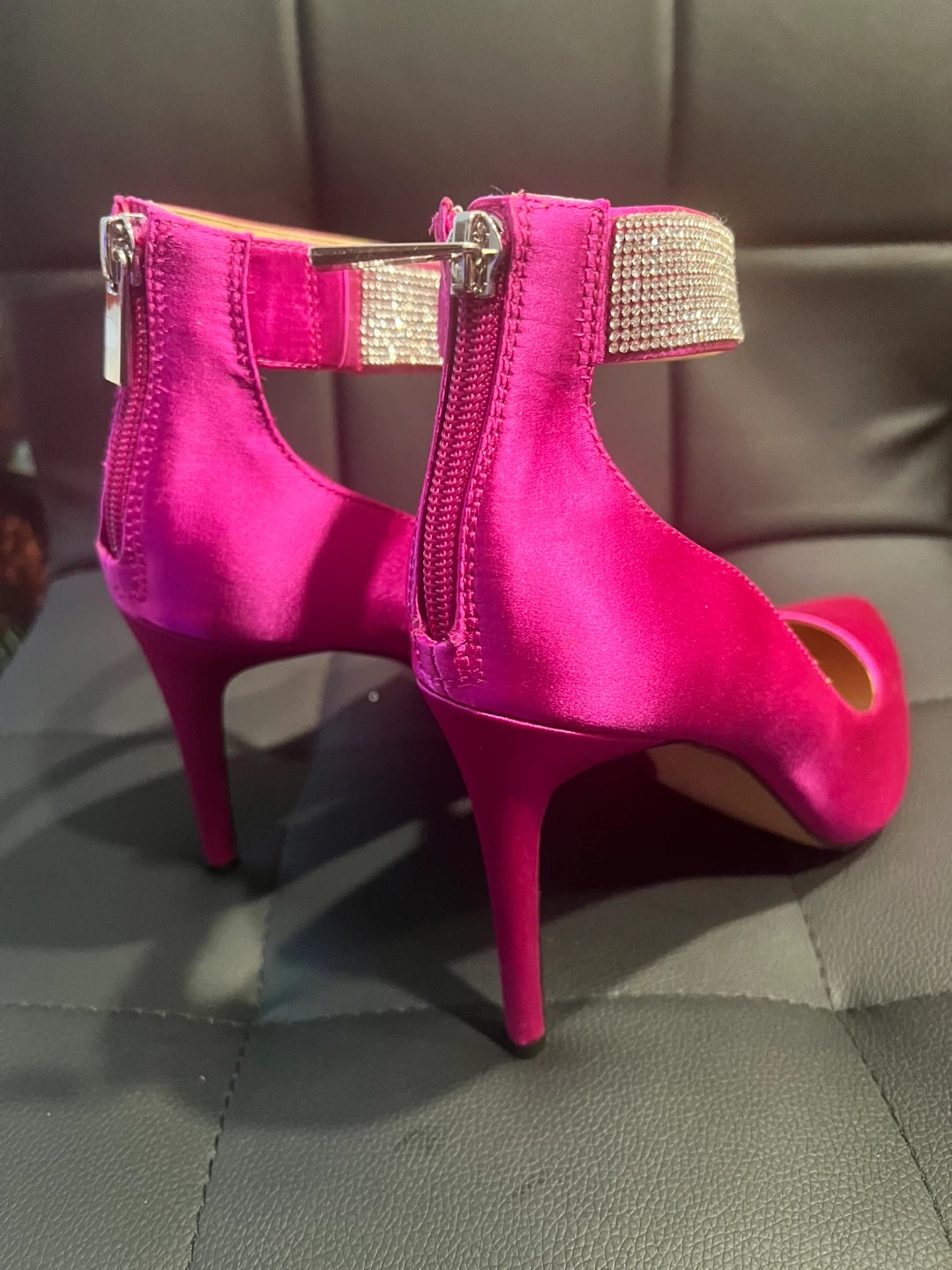 Never worn 3 1/2 in heels in a vibrant pink color! They feature a rhinestone ankle strap and a stiletto heel. Perfect for adding a pop of color to your outfit! Perfect for upcoming holiday parties