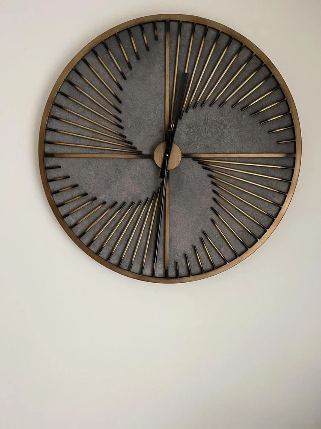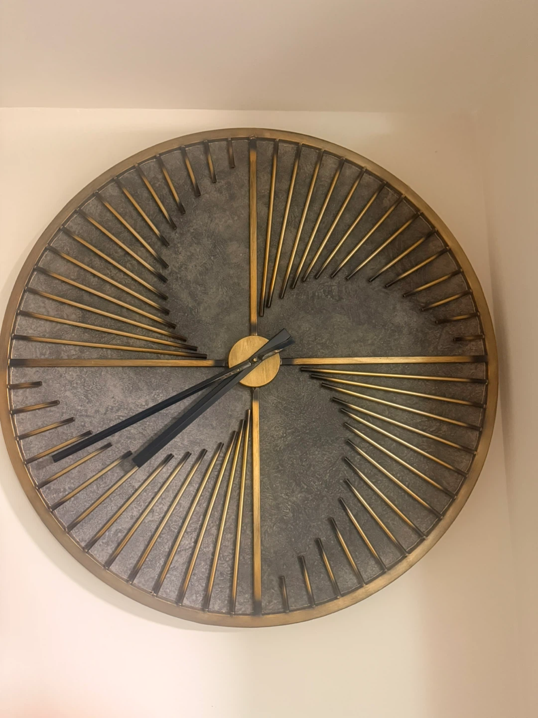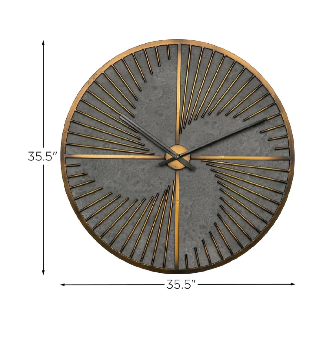Selling a large round wall clock. It measures 35.5 inches in diameter. It features a unique design with gold-colored accents and a gray face. It's a stylish piece that would look great in any room!