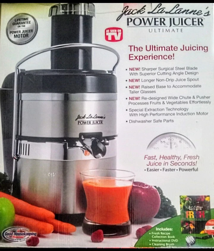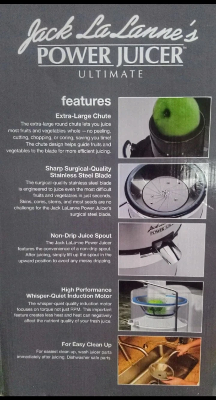 Selling a Jack LaLanne's Power Juicer Ultimate! It features an extra-large chute, surgical-quality stainless steel blade, non-drip juice spout, and a whisper-quiet induction motor. It's also designed for easy clean up with dishwasher safe parts! Includes a fresh recipe collection book, instructional DVD, and cleaning brush