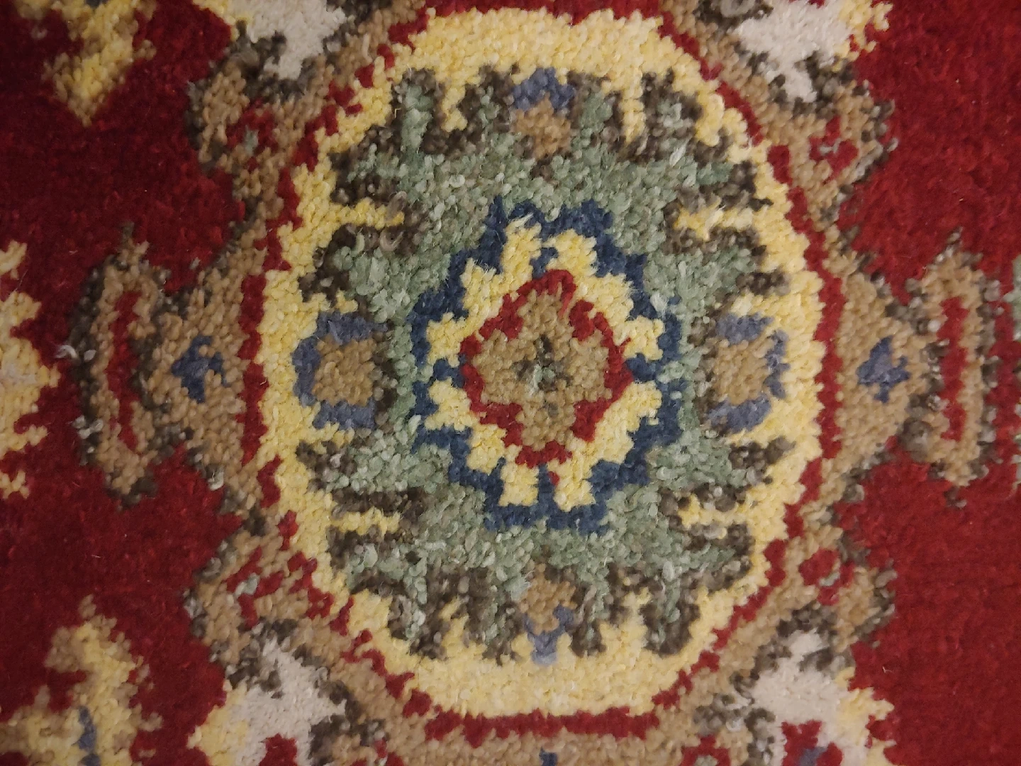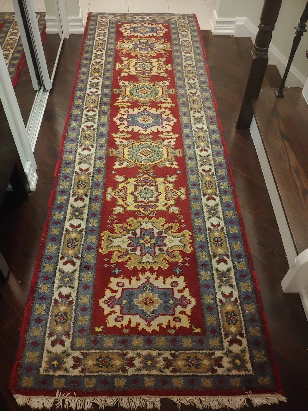 A colourful runner with a red, blue, and beige pattern. It's in very good condition and good quality. I'm not sure what material it is but seems to be wool. it rolls easily. Coming from a smoke free pet free home, no stains, does not shed. I purchased it from home sense for $100. it's about 10 feet long but msg me for exact measurements.