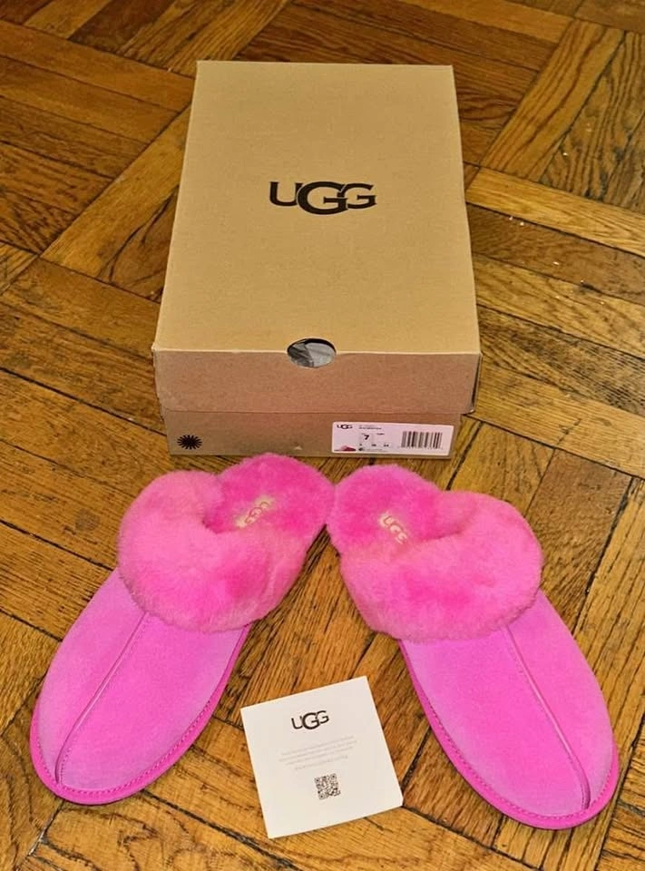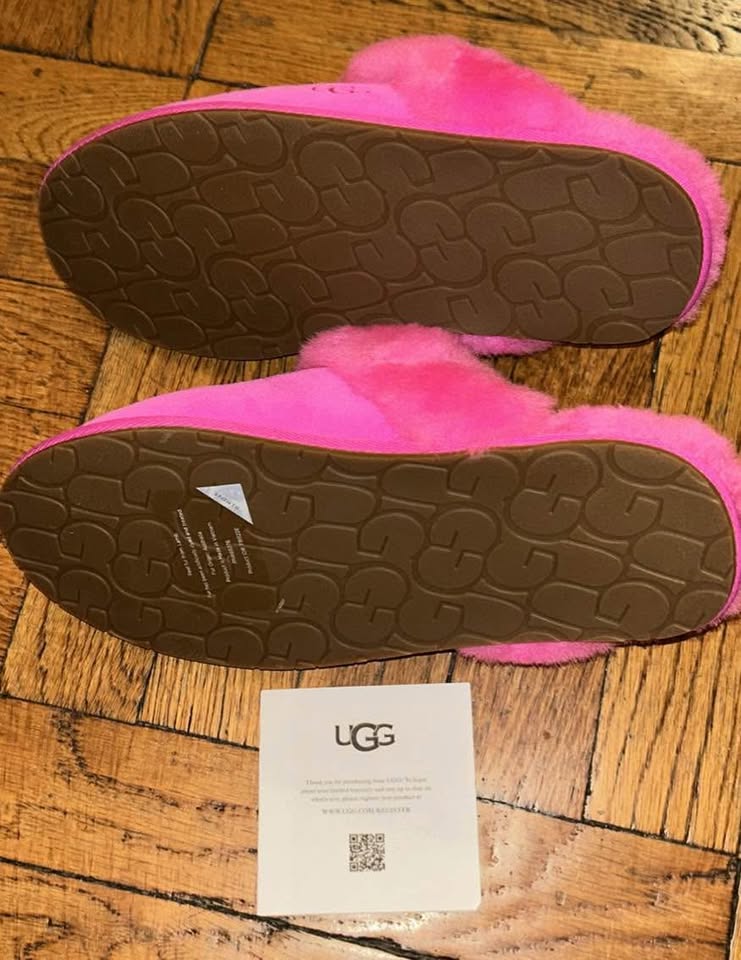 These are a gorgeous, hot pink pair of authentic cozy UGG Scuffette II slide slippers. Suede uppers and genuine shearling lining. New in box, never worn. Original MSRP $100. Size 7.