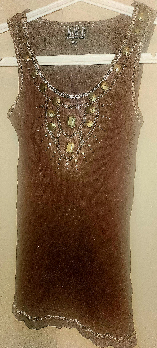Here's a cute brown tank top from NWD New Woman Design! It's a size small and features lovely embellishments of Copper around the neckline. Perfect for adding a bit of sparkle to your outfit! 100% Cotton. Pickup Only.