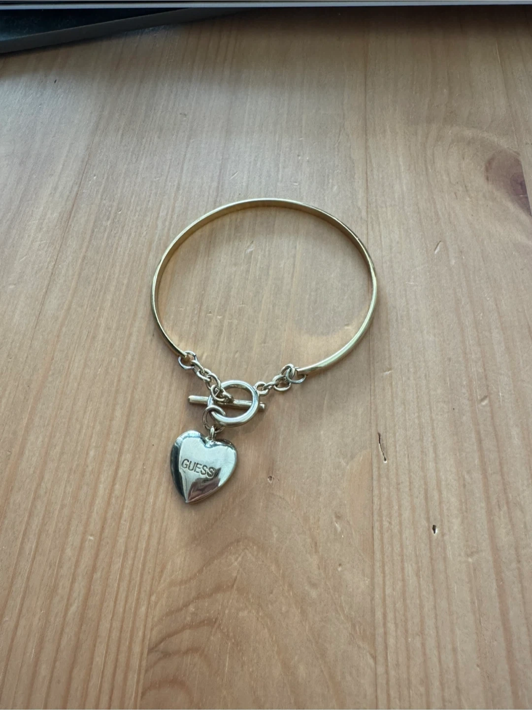 This is a cute Guess gold tone bangle bracelet with a heart charm! The charm has the Guess logo on it. It's in great condition and would be a lovely addition to any jewelry collection