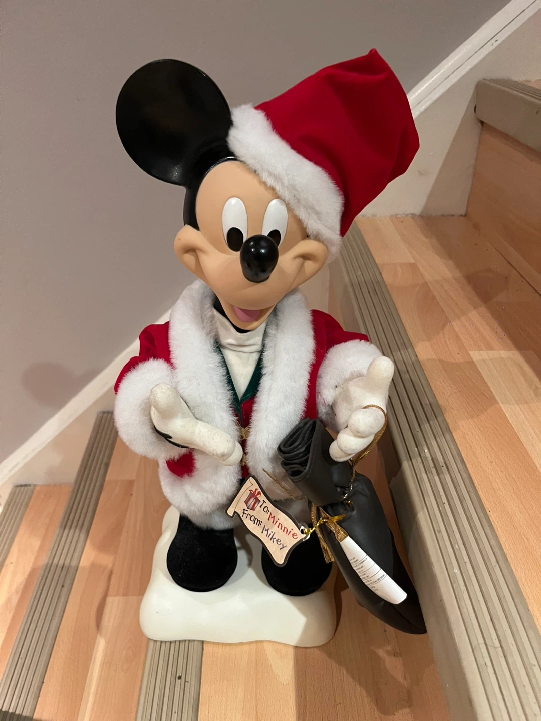 10A cute Christmas Mickey Mouse figurine! It's dressed in a Santa suit and holding a gift bag. Perfect for holiday decor!