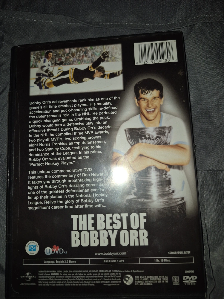 Selling The Best of Bobby Orr DVD, a commemorative look at the hockey legend's career. Relive the glory of Bobby Orr's magnificent career with this unique DVD featuring commentary from Ron Hewat. It takes you through the dazzling career of one of the greatest defenseman ever to tie up their skates in the National Hockey League
