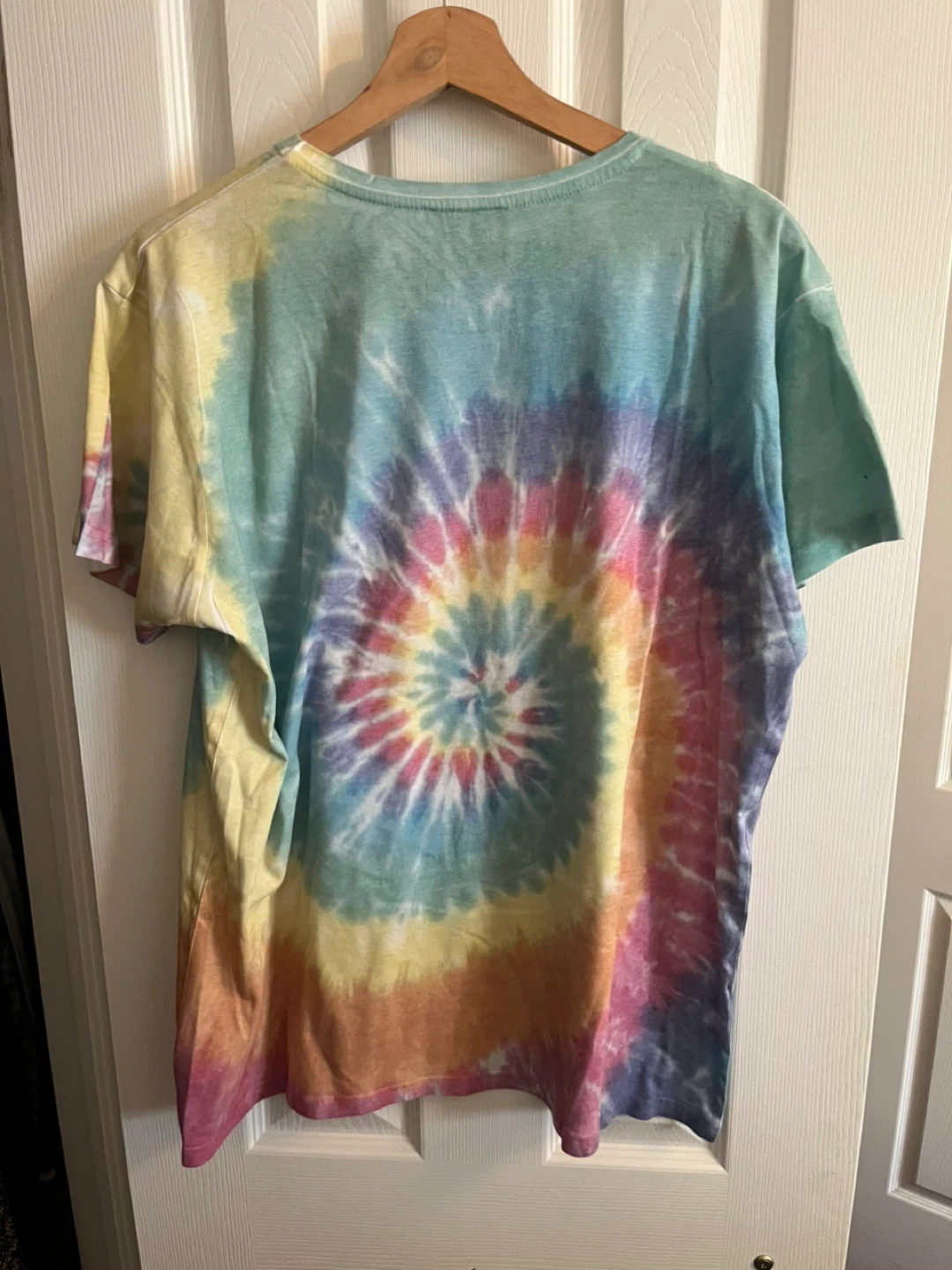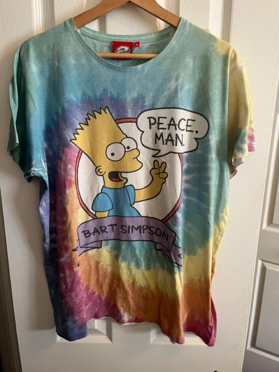 Selling a fun and colourful The Simpsons vintage Bart Simpson tie-dye t-shirt! It's an XL size and features Bart Simpson with a "Peace Man" classic graphic on the front. The back has a cool spiral tie-dye design. Perfect for any Simpsons fan!