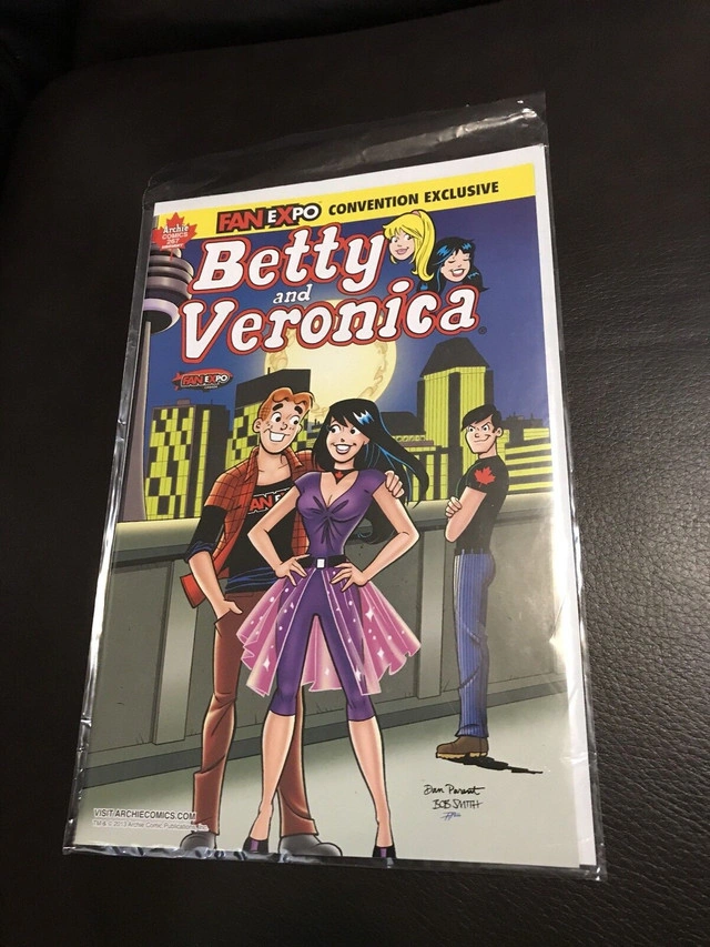 Betty and Veronica #267 - Fan Expo conventions exclusive variant cover as pictured. Limited edition of 400, Fan Expo night. Canada Fan Expo Convention Exclusive Night Variant Cover by Dan Parent. This cover connects with the Day Time Fan Expo Variant. Limited to 400 copies. (W) Dan Parent (A) Jeff Shultz & Various. Betty and Veronica in 'Little Mermaids' - The storybook series rolls on, this time with Betty and Veronica as mermaid princesses in an aquatic adventure! Betty is unhappy with her life under the sea and wishes to be a part of the human world - much to the chagrin of her father, King Tritonkins, and her step-sister Veronica! Things get even more complicated when she and Veronica venture to the surface and save the life of the human Prince Archie - and both fall in love with him! In order to re-connect with their human love interest, they must make a sacrifice. Enter: the evil sea-witch Cheryl. When she gives them an offer they can't refuse, is it so long to the sub-aquatic world and, if so, at what cost? Find out in this Archie-fied take on the classic 'Little Mermaid' story! Published: 2013. Writer(s): Dan Parent. Artist(s): Jeff Shultz. Cover artist(s): Dan Parent.