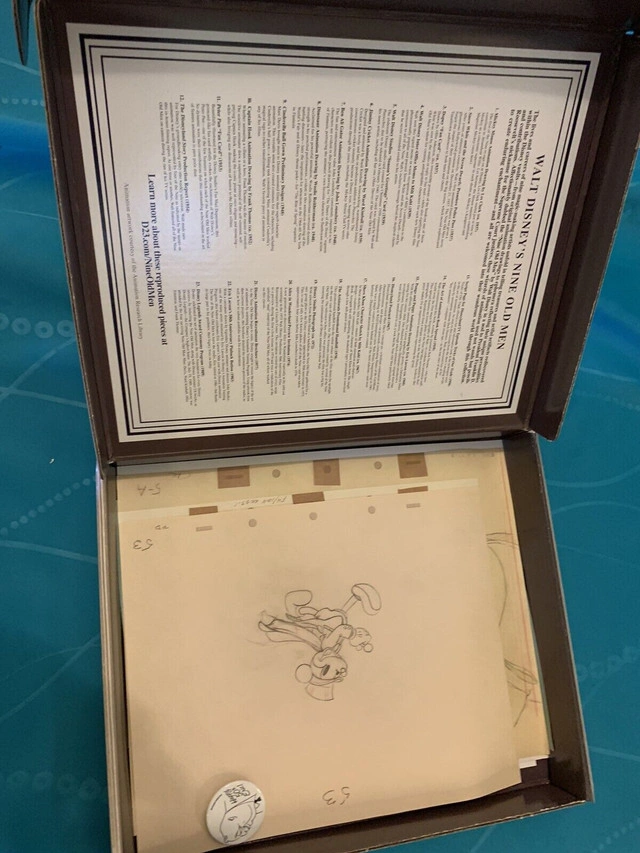 This is a fantastic item for any Disney fan. Given out as a gift for D23 members Nine Old Men collection includes 23 (this set is missing one piece so 22) reproduction pieces of art and memorabilia from the early Disney movies pulled from the vaults. The items look like the original and would be great to frame.