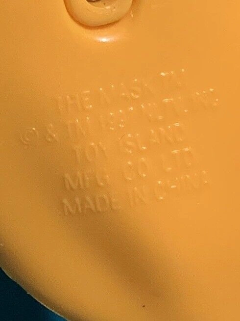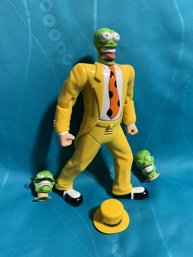 59This great 8-9" (taller with the hat) talk figure is a perfect toy to represent this film. Jim Carrey's The Mask Simply push a head in with a hat and push the button. The head pops off and a new head pops in with the eyes all bugged out! Tested and it says 2 phrases and a sound ! "Somebody stop me"...form buying this great figure! there are a few different versions of this out there and I think this was the largest made. comes with main figure, 2 extra heads and a hat (missing whatever he held in his hand) looks like it might have had something written in marker on the back that should come off.